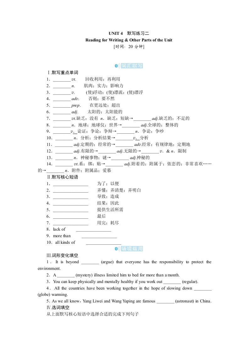 学生啦:UNIT4默写练习二Reading for Writing Other Parts of the Unit[时间:20分钟]I默写重点单词回收利用:再利用2.n.肌肉:实力:影响力3..(使)浮动:(使)漂流:(使)漂浮4.adv否则:要不然5.prep.在更远处:超出6.太阳的:太阳能的7.t.缺乏:没有n.缺乏:短缺→8.n.地球:地球仪:世界→ad山.全球的:整体的10.11.a.经常:有规律地:定期地12.ad.有限的→ad.无限的→13.n.神秘事物:谜→ad.神秘的14.a山.附着的:附属于:依恋的:非常喜欢…n.附件:附属品:爱慕Ⅱ默写核心短语1.为了:以便2.弄懂:弄清楚:弄明白导致:造成4.结果:因此提供生活所需6.最后用完:耗尽8.lack of9.more than10.all kinds of⑧语境运用Ⅲ词形变化填空1.It is beyond(argue)that everyone has the responsibility to protect theenvironment.2.A(mystery)illness limited him to bed for more than a month.3.You can keep physically and mentally healthy if you work out(regular).4.All the countries have been working together in the hope of slowing down(globe)warming.5.As we all know,Yang Liwei and Wang Yaping are famous(astronaut)in China从上面默写核心短语中选择合适的完成下列句子