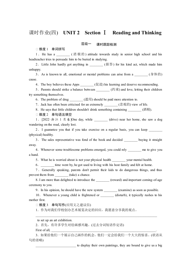 学生啦:课时作业(四)UNIT 2Section I Reading and Thinking层级一课时跟踪检测口维度1单词拼写1.He has a(消极的)attitude towards study in senior high school and hisheadteacher tries to persuade him to be buried in studying.2.Little John hardly got anything in(报答)for his kind act,,which made himunhappy.3.As is known to all,emotional or mental problems can arise from a(身体的)cause.4.The boy believes these Apps(促进)his leaming and deserve recommending..5.Parents should strike a balance between(约束)and love,letting their childrentry something themselves.6.The problem of drug(滥用)should be paid more attention to.7.Jack has often been criticised for an extremely(悲观的)view of life8.He says that little children shouldn't drink something containing(酒精).口维度2单句语法填空1,[2022·浙江1月卷]One day,.while(drive)near her home,she saw a dogwandering on the road,clearly lost.2.I guarantee you that if you take exercise on a regular basis,you can keep(physical)healthy.3.The sales representative was fond of the book and decidedbuying it straightaway.4.Whenever some troublesome problems emerged,you could relyme to give youa hand.5.What he is worried about is not your physical healthyour mental health.6.time went by,he got used to living with his host family and felt at home.7.Generally speaking,parents don't permit their kids to do dangerous things,and thusprevent them from(take)a chance.8.I am more than delighted to introduce the(reward)and important coming-of-ageceremony to you.9.In his opinion,he should have the new system(examine)as soon as possible.10.Whenever a young child is frightened or(disturb),it typically rushes to hismother first.口维度3单句写作(应用文之建议信)1.作为对我们学校创办艺术展览决定的回应,我愿意分享我的观点。to set up an art exhibition.2.首先,有许多学生对绘画感兴趣。(过去分词短语作定语)First of all,3.如果给他们一个展示自己画作的机会,他们一定会给我们一个大大的惊喜。(状语从句的省略)to display their own paintings,they are bound to give us a big