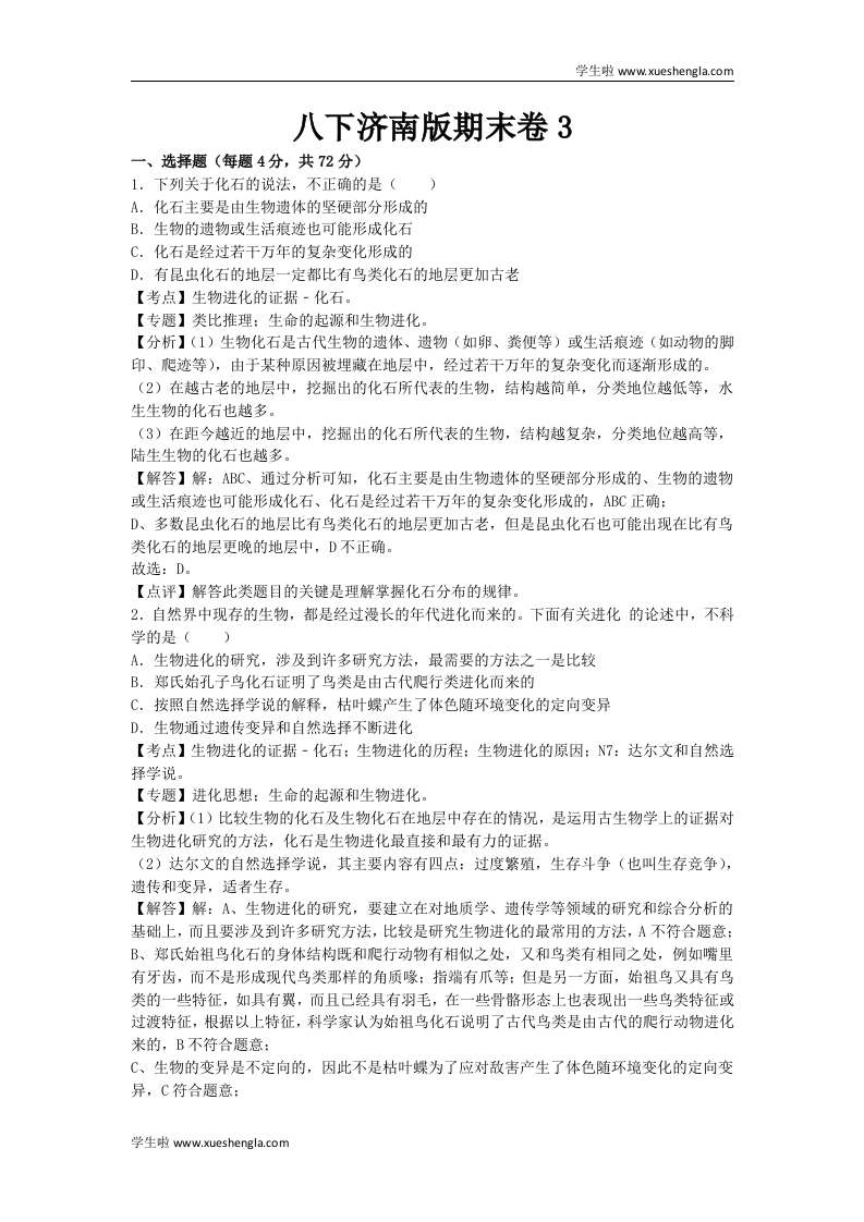学生啦:学生啦www,xueshengla.com八下济南版期末卷3一、选择题(每题4分,共72分)1.下列关于化石的说法,不正确的是(A.化石主要是由生物遗体的坚硬部分形成的B.生物的遗物或生活痕迹也可能形成化石C.化石是经过若干万年的复杂变化形成的D.有昆虫化石的地层一定都比有鸟类化石的地层更加古老【考点】生物进化的证据-化石。【专题】类比推理:生命的起源和生物进化。【分析】(1)生物化石是古代生物的遗体、遗物(如卵、粪便等)或生活痕迹(如动物的脚印、爬迹等),由于某种原因被埋藏在地层中,经过若干万年的复杂变化而逐渐形成的。(2)在越古老的地层中,挖掘出的化石所代表的生物,结构越简单,分类地位越低等,水生生物的化石也越多。(3)在距今越近的地层中,挖掘出的化石所代表的生物,结构越复杂,分类地位越高等,陆生生物的化石也越多。【解答】解:ABC、通过分析可知,化石主要是由生物遗体的坚硬部分形成的、生物的遗物或生活痕迹也可能形成化石、化石是经过若干万年的复杂变化形成的,ABC正确:D、多数昆虫化石的地层比有鸟类化石的地层更加古老,但是昆虫化石也可能出现在比有鸟类化石的地层更晚的地层中,D不正确。故选:D。【点评】解答此类题目的关键是理解掌握化石分布的规律。2.自然界中现存的生物,都是经过漫长的年代进化而来的。下面有关进化的论述中,不科学的是()A.生物进化的研究,涉及到许多研究方法,最需要的方法之一是比较B.郑氏始孔子鸟化石证明了鸟类是由古代爬行类进化而来的C.按照自然选择学说的解释,枯叶蝶产生了体色随环境变化的定向变异D.生物通过遗传变异和自然选择不断进化【考点】生物进化的证据-化石:生物进化的历程:生物进化的原因:N7:达尔文和自然选择学说。【专题】进化思想:生命的起源和生物进化【分析】(1)比较生物的化石及生物化石在地层中存在的情况,是运用古生物学上的证据对生物进化研究的方法,化石是生物进化最直接和最有力的证据。(2)达尔文的自然选择学说,其主要内容有四点:过度繁殖,生存斗争(也叫生存竞争),遗传和变异,适者生存。【解答】解:A、生物进化的研究,要建立在对地质学、遗传学等领域的研究和综合分析的基础上,而且要涉及到许多研究方法,比较是研究生物进化的最常用的方法,A不符合题意:B、郑氏始祖鸟化石的身体结构既和爬行动物有相似之处,又和鸟类有相同之处,例如嘴里有牙齿,而不是形成现代鸟类那样的角质喙:指端有爪等:但是另一方面,始祖鸟又具有鸟类的一些特征,如具有翼,而且己经具有羽毛,在一些骨骼形态上也表现出一些鸟类特征或过渡特征,根据以上特征,科学家认为始祖鸟化石说明了古代鸟类是由古代的爬行动物进化来的,B不符合题意:C、生物的变异是不定向的,因此不是枯叶蝶为了应对敌害产生了体色随环境变化的定向变异,C符合题意:学生啦www.xueshengla.com