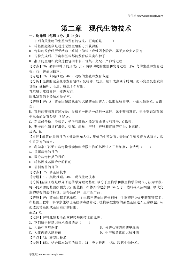 学生啦:学生啦www.xueshengla.com第二章现代生物技术一、选择题(每题4分,共32分)1.下列有关生物的生殖和发育的说法,正确的是(A.转基因超级鼠是通过无性生殖的方式获得的B.青蛙的发育经历受精卵→蝌蚪→幼蛙→成蛙四个阶段,属于完全变态发育C.传粉完成后,子房和胚珠都能发育成果实和种子D.燕子的生殖和发育过程包括求偶、筑巢、交配、产卵等过程【考点】7G:果实和种子的形成:J3:两栖动物的生殖和发育过程:J5:鸟的生殖和发育过程:P2:转基因技术.【专题】33:归纳推理:463:动物的生殖和发育专题【分析】昆虫的完全变态发育包括:受精卵、幼虫、蛹和成虫四个时期,而不完全变态发育包括:受精卵、若虫、成虫3个时期。青蛙属于雌雄异体,变态发育。胎儿发育的主要场所是子宫。【解答】解:A、转基因超级鼠是将大鼠的基因转入小鼠的受精卵中,不是无性生殖。A错B、青蛙的变态发育过程是:受精卵→蝌蚪→幼蛙→成蛙,属于变态发育,完全变态发育属于昆虫的发育类型,B错误。C、花完成传粉、受精后,子房和胚珠才能发育成果实和种子,C错误:D、燕子的生殖具有求偶、交配、筑巢、产卵、孵卵和育雏等行为,D正确。故选:D。【点评】解答此类题目的关键是熟知人体、果蝇的生殖发育、青蛙的生殖发育方式特点、鸟生殖发育的特点。2.科学家可以通过病毒携带动植物或微生物的基因进入正常细胞,来达到()A.杀死病毒的目的B.区分病毒种类的目的C.转基因或基因治疗的目的D.研制疫苗的目的【考点】P2:转基因技术【专题】31:类比推理:482:现代生物技术【分析基因工程是以分子遗传学为理论基础,以分子生物学和微生物学的现代方法为手段,将不同来源的基因按预先设计的蓝图,在体外构建杂种DNA分子,然后导入活细胞,以改变生物原有的遗传特性、获得新品种、生产新产品。【解答】解:转基因技术就是把一个生物体的基因转移到另一个生物体DNA中的生物技术。在基因工程中,科学家能够让某些病毒携带动、植物或微生物的某些基因进入正常细胞,从而达到转基因或基因治疗的目的。故选:C。【点评】解答此题要全面掌握转基因技术的原理。3.下列属于转基因技术成果的是()A.大肠杆菌噬菌体B.分解动物粪便的甲慌菌C.人体内的大肠杆菌D.生产胰岛素的大肠杆菌【考点】P2:转基因技术【专题】152:结合课本知识的信息:31:类比推理:482:现代生物技术.学生啦www.xueshengla.com
