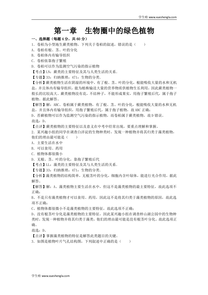 学生啦:学生啦www.xueshengla.com第一章生物圈中的绿色植物一、选择题(每题4分,共60分)1.卷柏为小型地生蕨类植物,下列关于卷柏的叙述,错误的是()A.卷柏有根、茎、叶的分化B.卷柏体内有输导组织C.卷柏依靠孢子繁殖D.卷柏可以作为监测空气污染的指示植物【考点】LN:蕨类的主要特征及其与人类生活的关系【专题】33:归纳推理:471:生物的分类.【分析】蕨类植物生活在阴湿的环境中,有了根、茎、叶的分化,根能吸收大量的水和无机盐,并且体内有输导组织,能为植株输送大量的营养物质供植物生长利用,因此蕨类植物一般长的比较高大。蕨类植物没有花,不结种子,不能形成果实,用孢子繁殖后代,属于孢子植物。据此解答。【解答】解:ABC、卷柏属于蕨类植物,有了根、茎、叶的分化,根能吸收大量的水和无机盐,并且体内有输导组织,用孢子繁殖后代,属于孢子植物,故ABC正确:D、苔藓植物可以作为监测空气污染的指示植物,而卷柏属于蕨类植物,故D错误。故选:D。【点评】蕨类植物的主要特征以及意义在中考中经常出现,要重点理解和掌握。2.某兴趣小组的同学在调查白洋淀的生物种类时,发现一种植物并将其归类于藻类植物,他们的理由最可能是()A.主要生活在水中B.可以食用、药用C.植物体都很微小D.无根、茎、叶的分化,靠孢子繁殖后代【考点】LL:藻类的主要特征及其与人类生活的关系,【专题】33:归纳推理:471:生物的分类,【分析】藻类植物的结构简单,无根茎叶的分化,细胞内含叶绿体,能进行光合作用,据此解答。【解答】解:A、藻类植物主要生活在水中,但这不是藻类植物的最主要特征,故此选项不正确:B、不是只有藻类植物才可以食用、药用,因此这不是将其归类于藻类植物的原因,故此选项不正确:C、植物体都很微小不是藻类植物的主要特征,故此选项不正确:D、没有根茎叶分化是藻类植物的主要特征,因此某兴趣小组在调查梓山湖公园中的生物种类时,发现一种植物并将其归类于藻类,他们的理由最可能是没有根茎叶分化。故此选项正确。故选:D。【点评】掌握藻类植物的特征是解答此类题目的关键。3.如图是植物叶片气孔结构图,下列叙述中正确的是()学生啦www.xueshengla.com