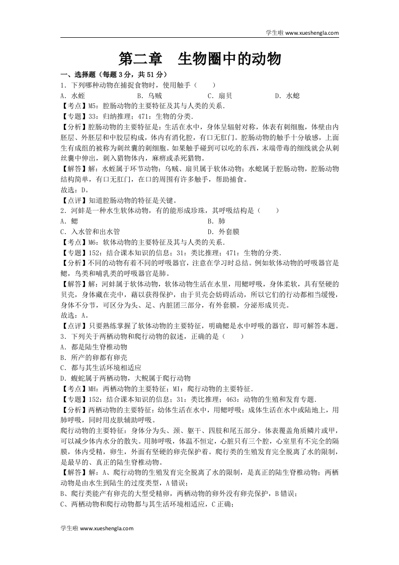学生啦:学生啦wwww,xueshengla.com第二章生物圈中的动物一、选择题(每题3分,共51分)1.下列哪种动物在捕捉食物时,使用触手()A.水蛭B.乌贼C.扇贝D.水螅【考点】M5:腔肠动物的主要特征及其与人类的关系.【专题】33:归纳推理:471:生物的分类.【分析】腔肠动物的主要特征是:生活在水中,身体呈辐射对称,体表有刺细胞,体壁由内胚层、外胚层和中胶层构成,体内有消化腔,有口无肛门。腔肠动物的触手十分敏感,上面生有成组的被称为刺丝囊的刺细胞。如果触手碰到可以吃的东西,末端带毒的细线就会从刺丝囊中伸出,刺入猎物体内,麻痹或杀死猎物。【解答】解:水蛭属于环节动物:乌贼、扇贝属于软体动物:水螅属于腔肠动物,腔肠动物结构简单,有口无肛门,在口的周围有许多触手,帮助捕食。故选:D。【点评】知道腔肠动物的特征是关键。2.河蚌是一种水生软体动物,有的能形成珍珠,其呼吸结构是()A.鳃B.肺C.入水管和出水管D.外套膜【考点】M6:软体动物的主要特征及其与人类的关系.【专题】152:结合课本知识的信息:31:类比推理:471:生物的分类【分析】不同的动物有着不同的呼吸器宫,注意在学习时总结。例如软体动物的呼吸器宫是鳃,鸟类和哺乳类的呼吸器官是肺。【解答】解:河蚌属于软体动物,软体动物生活在水里,用鳃呼吸,身体柔软,具有坚硬的贝壳,身体藏在壳中,藉以获得保护,由于贝壳会妨碍活动,所以它们的行动都相当缓慢,身体不分节,可区分为头、足、内脏团三部分,有外套膜,分泌形成贝壳。故选:A。【点评】只要熟练掌握了软体动物的主要特征,明确鳃是水中呼吸的器官,即可解答本题。3.下列关于两栖动物和爬行动物的叙述,正确的是()A.都是陆生脊椎动物B.所产的卵都有卵壳C.都与其生活环境相适应D.蝮蛇属于两栖动物,大鲵属于爬行动物【考点】:两栖动物的主要特征:MI:爬行动物的主要特征.【专题】152:结合课本知识的信息:31:类比推理:463:动物的生殖和发育专题.【分析】两栖动物的主要特征:幼体生活在水中,用鳃呼吸:成体生活在水中或陆地上,用肺呼吸,同时用皮肤辅助呼吸。爬行动物的主要特征:身体分为头、颈、躯干、四肢和尾五部分。体表覆盖角质鳞片或甲,可以减少体内水分的散失。用肺呼吸,体温不恒定,心脏只有三个腔,心室里有不完全的隔膜,体内受精,卵生,外面有坚硬的卵壳保护着。爬行类的生殖发育完全脱离了水的限制,是最早的、真正的陆生脊椎动物。【解答】解:A、爬行动物的生殖发育完全脱离了水的限制,是真正的陆生脊椎动物:两栖动物是由水生到陆生的过度类型,A错误:B、爬行类能产有卵壳的大型受精卵,两栖动物的卵外没有卵壳保护,B错误:C、两栖动物和爬行动物都与其生活环境相适应,C正确:学生啦www.xueshengla.com