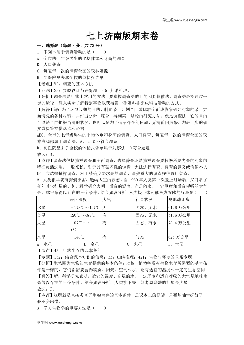 学生啦:学生啦www.xueshengla.com七上济南版期末卷一、选择题(每题4分,共72分)1.下列不属于调查活动的是()A.全市的七年级男生的平均体重和身高的调查B.人口普查C.每五年一次的清查全国的森林资源D.到医院里去拿全校的体检报告单【考点】V3:调查的基本方法.【专题】23:实验设计与评价题:33:归纳推理,【分析】调查法是生物上常用的方法,要掌握调查法的目的和具体做法。调查法是指通过一定的途径,深入实际了解特定事物以获得第一手资料并完成科技活动的方式。【解答】解:为了达到设想的目的,制定某一计划全面或比较全面地收集研究对象的某一方面情况的各种材料,并作出分析、综合,得到某一结论的研究方法,就是调查法。它的目的可以是全面把握当前的状况,也可以是为了揭示存在的问题,弄清前因后果,为进一步的研究或决策提供观点和论据。ABC、全市的七年级男生的平均体重和身高的调查、人口普查、每五年一次的清查全国的森林资源都属于调查法。A、B、C不符合题意。D、到医院里去拿全校的体检报告单属于观察法。D符合题意。故选:D。【点评】调查法包括抽样调查和全面调查,选择普查还是抽样调查要根据所要考查的对象的特征灵活选用,一般来说,对于具有破坏性的调查、无法进行普查、普查的意义或价值不大时,应选择抽样调查,对于精确度要求高的调查,事关重大的调查往往选用普查。2.人类很早就有探索宇宙、邀游太空的梦想。自1969年人类第一次登上月球后,又开启了登陆其它行星的计划。科学研究表明,适宜的温度、充足的水、一定厚度和适宜呼吸的大气是地球生命得以存在的三个条件。结合如表分析,人类接下来可能考虑登陆的行星是(表面温度大气行星状况离地球距离水星无固态、无水91.6万公里金星420℃-485℃有固态、无水41.6万公里火星有固态、有水78.4万公里5℃木星-148℃有气态628万公里A.水星B.金星C.火星D.木星【考点】45:生物生存的基本条件.【专题】152:结合课本知识的信息:33:归纳推理:421:生物与环境的关系专题.【分析】生物圈为生物的生存提供的基本条件:动物、植物等所有生物生存所需要的基本条件是一样的,它们都需要营养物质、阳光、空气和水,还有适宜的温度和一定的生存空间。【解答】解:科学研究表明,适宜的温度、充足的水、一定厚度和适宜呼吸的大气是地球生命得以存在的三个条件。结合如表分析,人类接下来可能考虑登陆的行星是火星故选:C。【点评】这题就是直接考查了生物生存的基本条件,是课本上的原话,只要基础掌握好了一般不会出错。3.学习生物学的重要方法是()学生啦www.xueshengla.com