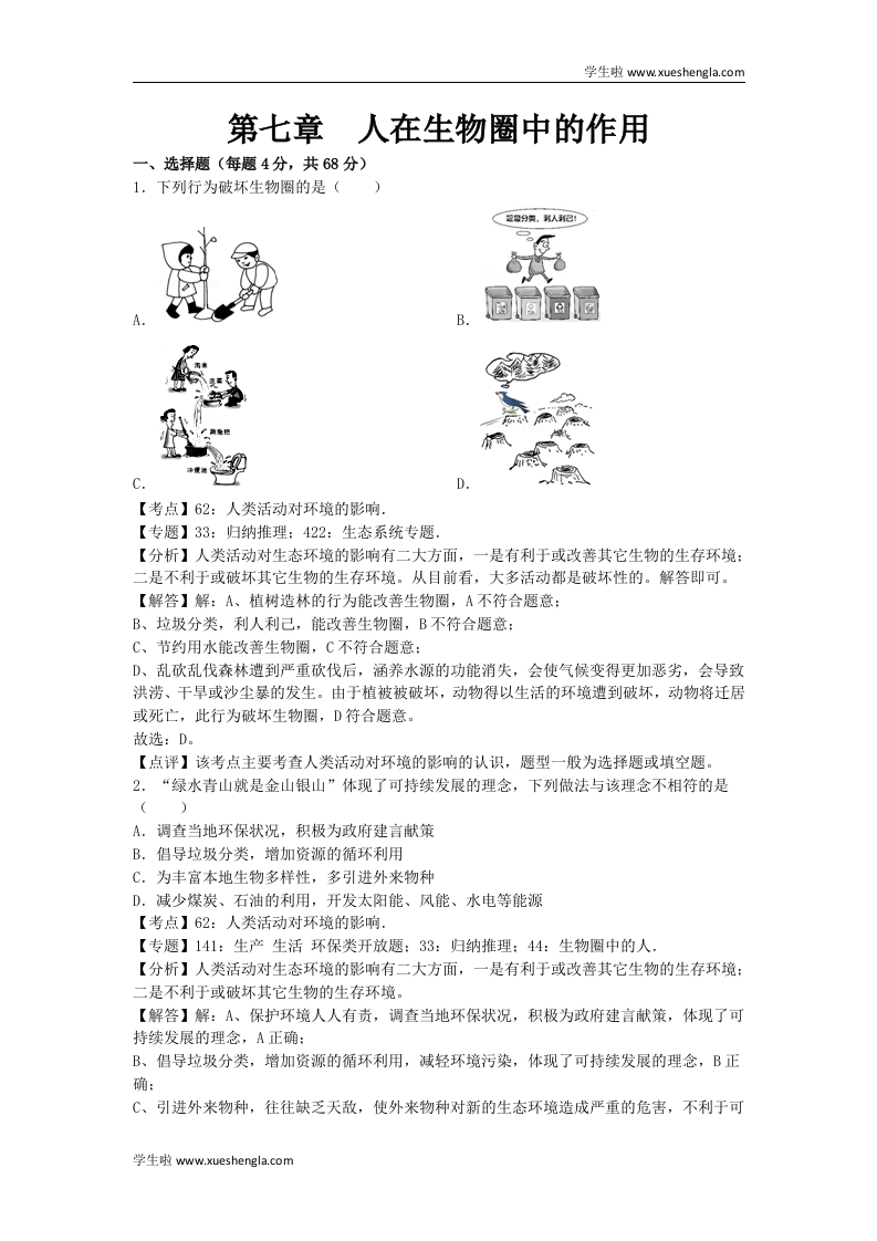 学生啦:学生啦www.xueshengla.com第七章人在生物圈中的作用一、选择题(每题4分,共68分)1.下列行为破坏生物圈的是()BD【考点】62:人类活动对环境的影响【专题】33:归纳推理:422:生态系统专题【分析】人类活动对生态环境的影响有二大方面,一是有利于或改善其它生物的生存环境:二是不利于或破坏其它生物的生存环境。从目前看,大多活动都是破坏性的。解答即可。【解答】解:A、植树造林的行为能改善生物圈,A不符合题意:B、垃圾分类,利人利己,能改善生物圈,B不符合题意:C、节约用水能改善生物圈,C不符合题意:D、乱砍乱伐森林遭到严重砍伐后,涵养水源的功能消失,会使气候变得更加恶劣,会导致洪涝、干旱或沙尘暴的发生。由于植被被破坏,动物得以生活的环境遭到破坏,动物将迁居或死亡,此行为破坏生物圈,D符合题意。故选:D。【点评】该考点主要考查人类活动对环境的影响的认识,题型一般为选择题或填空题。2.“绿水青山就是金山银山”体现了可持续发展的理念,下列做法与该理念不相符的是A.调查当地环保状况,积极为政府建言献策B.倡导垃圾分类,增加资源的循环利用C.为丰富本地生物多样性,多引进外来物种D.减少煤炭、石油的利用,开发太阳能、风能、水电等能源【考点】62:人类活动对环境的影响,【专题】141:生产生活环保类开放题:33:归纳推理:44:生物圈中的人,【分析】人类活动对生态环境的影响有二大方面,一是有利于或改善其它生物的生存环境:二是不利于或破坏其它生物的生存环境。【解答】解:A、保护环境人人有责,调查当地环保状况,积极为政府建言献策,体现了可持续发展的理念,A正确:B、倡导垃圾分类,增加资源的循环利用,减轻环境污染,体现了可持续发展的理念,B正C、引进外来物种,往往缺乏天敌,使外来物种对新的生态环境造成严重的危害,不利于可学生啦wwww,xueshengla.com