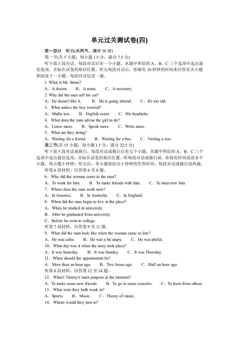 学生啦:单元过关测试卷(四)第一部分听力(共两节,满分30分)第一节(共5小题:每小题1.5分,满分7.5分)听下面5段对话。每段对话后有一个小题,从题中所给的A、B、C三个选项中选出最佳选项,并标在试卷的相应位置。听完每段对话后,你都有10秒钟的时间来回答有关小题和阅读下一小题。每段对话仅读一遍。1.What is Mr.Stone?A.A doctor.B.A nurse.C.A secretary.2.Why did the man sell his car?A.He doesn't like it.B.He is going abroad.C.It's too old.3.What makes the boy worried?A.Maths test.B.English exam.C.His headache.4.What does the man advise the girl to do?A.Listen more.B.Speak more.C.Write more.5.What are they doing?A.Waiting for a friend.B.Waiting for a bus.C.Visiting a zoo.第二节(共15小题:每小题1.5分,满分22.5分)听下面5段对话或独白。每段对话或独白后有几个小题,从题中所给的A、B、C三个选项中选出最佳选项,并标在试卷的相应位置。听每段对话或独白前,你将有时间阅读各个小题,每小题5秒钟:听完后,各小题将给出5秒钟的作答时间。每段对话或独白读两遍。听第6段材料,回答第6至8题。6.Why did the woman come to the man?A.To work for him.B.To make friends with him.C.To interview him.7.Where does the man work now?A.In America.B.In Australia.C.In England.8.When did the man begin to live in the place?A.When he studied in universityB.After he graduated from university.C.Before he went to college.听第7段材料,回答第9至11题。9.What did the man look like when the woman came so late?A.He was calm.B.He was a bit angry.C.He was pitiful.10.What day was it when the story took place?A.It was Saturday.B.It was Sunday.C.It was Thursday.11.When should the appointment be?A.More than an hour ago.B.Two hours ago.C.Half an hour ago.听第8段材料,回答第12至14题。12.What's Timmy's main purpose at the moment?A.To make some new friends.B.To go to some concerts.C.To leam from others.13.What were they both weak in?A.Sports.B.Music.C.Theory of music.14.Whom would they turn to?