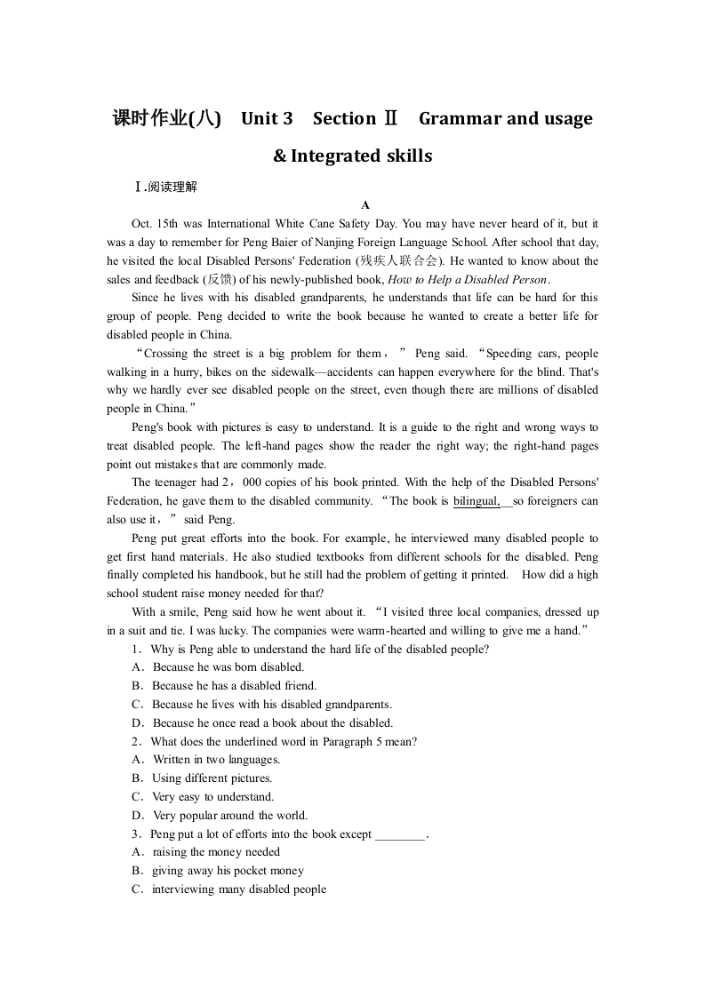 学生啦:课时作业(八)Unit 3 Section II Grammar and usageIntegrated skillsI.阅读理解Oct.15th was International White Cane Safety Day.You may have never heard of it,but itwas a day to remember for Peng Baier of Nanjing Foreign Language School.After school that day,he visited the local Disabled Persons'Federation(残疾人联合会).He wanted to know about thesales and feedback (of his newly-published book,How to Help a Disabled Person.Since he lives with his disabled grandparents,he understands that life can be hard for thisgroup of people.Peng decided to write the book because he wanted to create a better life fordisabled people in China."Crossing the street is a big problem for them,Peng said."Speeding cars,peoplewalking in a hury,bikes on the sidewalk-accidents can happen everywhere for the blind.That'swhy we hardly ever see disabled people on the street,even though there are millions of disabledpeople in China.”Peng's book with pictures is easy to understand.It is a guide to the right and wrong ways totreat disabled people.The left-hand pages show the reader the right way;the right-hand pagespoint out mistakes that are commonly made.The teenager had 2,000 copies of his book printed.With the help of the Disabled Persons'Federation,he gave them to the disabled community."The book is bilingual,so foreigners canalso use it,said Peng.Peng put great efforts into the book.For example,he interviewed many disabled people toget first hand materials.He also studied textbooks from different schools for the disabled.Pengfinally completed his handbook,but he still had the problem of getting it printed.How did a highschool student raise money needed for that?With a smile,Peng said how he went about it."I visited three local companies,dressed upin a suit and tie.I was lucky.The companies were warm-hearted and willing to give me a hand."1.Why is Peng able to understand the hard life of the disabled people?A.Because he was bom disabled.B.Because he has a disabled friend.C.Because he lives with his disabled grandparents.D.Because he once read a book about the disabled.2.What does the underlined word in Paragraph 5 mean?A.Written in two languages.B.Using different pictures.C.Very easy to understand.D.Very popular around the world.3.Peng put a lot of efforts into the book exceptA.raising the money neededB.giving away his pocket moneyC.interviewing many disabled people
