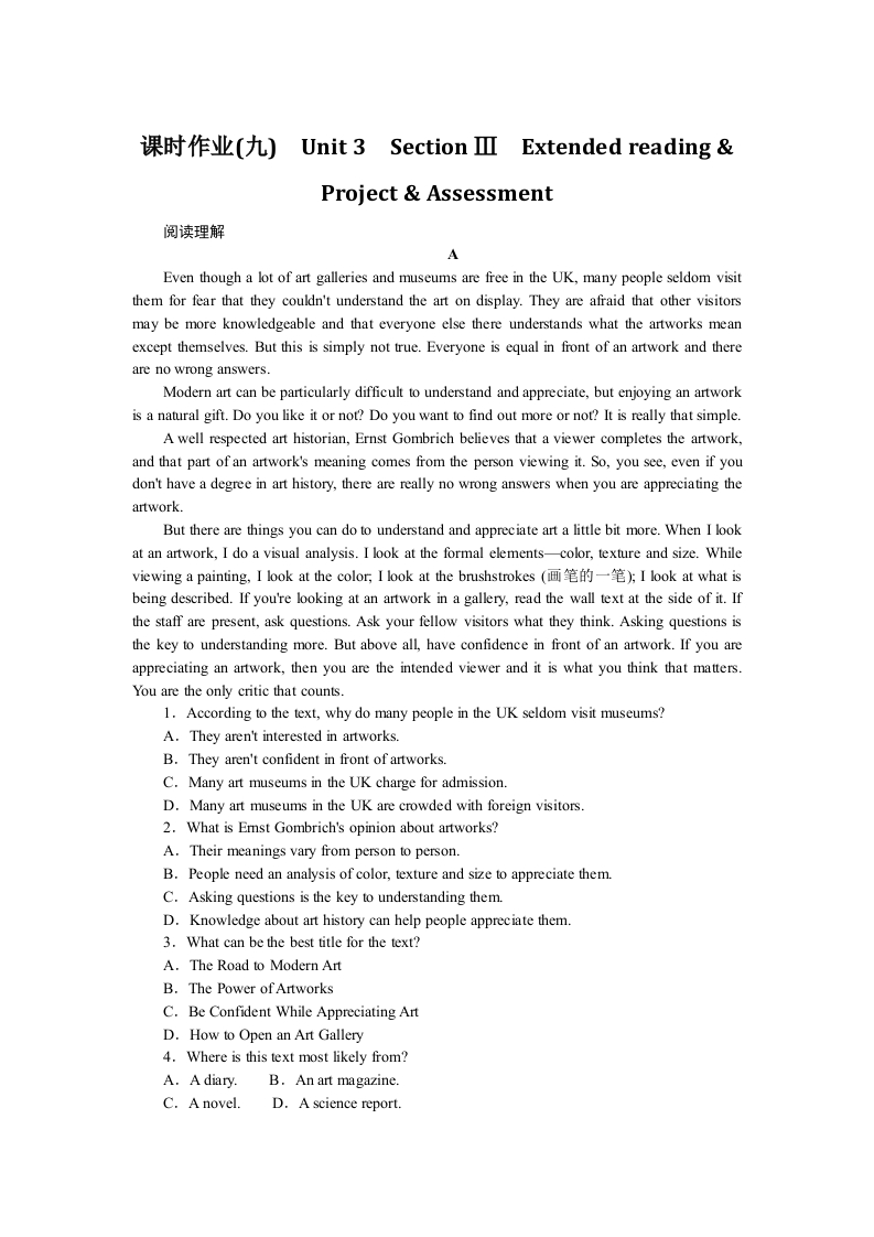 学生啦:课时作业(九)Unit3 SectionⅢExtended reading&Project Assessment阅读理解Even though a lot of art galleries and museums are free in the UK,many people seldom visitthem for fear that they couldn't understand the art on display.They are afraid that other visitorsmay be more knowledgeable and that everyone else there understands what the artworks meanexcept themselves.But this is simply not true.Everyone is equal in front of an artwork and thereare no wrong answers.Modern art can be particularly difficult to understand and appreciate,but enjoying an artworkis a natural gift.Do you like it or not?Do you want to find out more or not?It is really that simple.A well respected art historian,Ernst Gombrich believes that a viewer completes the artwork,and that part of an artwork's meaning comes from the person viewing it.So,you see,even if youdon't have a degree in art history,there are really no wrong answers when you are appreciating theartwork.But there are things you can do to understand and appreciate art a little bit more.When I lookat an artwork,I do a visual analysis.I look at the formal elements-color,texture and size.Whileviewing a painting,I look at the color,I look at the brushstrokes(画笔的一笔)方I look at what isbeing described.If you're looking at an artwork in a gallery,read the wall text at the side of it.Ifthe staff are present,ask questions.Ask your fellow visitors what they think.Asking questions isthe key to understanding more.But above all,have confidence in front of an artwork.If you areappreciating an artwork,then you are the intended viewer and it is what you think that matters.You are the only critic that counts.1.According to the text,why do many people in the UK seldom visit museums?A.They aren't interested in artworks.B.They aren't confident in front of artworks.C.Many art museums in the UK charge for admission.D.Many art museums in the UK are crowded with foreign visitors.2.What is Emst Gombrich's opinion about artworks?A.Their meanings vary from person to person.B.People need an analysis of color,texture and size to appreciate them.C.Asking questions is the key to understanding them.D.Knowledge about art history can help people appreciate them.3.What can be the best title for the text?A.The Road to Modern ArtB.The Power ofArtworksC.Be Confident While Appreciating ArtD.How to Open an Art Gallery4.Where is this text most likely from?A.A diary.B.An art magazine.C.A novel.D.A science report.