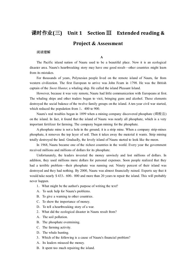 学生啦:课时作业(三)Unit 1 Section II Extended readingProject Assessment阅读理解The Pacific island nation of Naur used to be a beautiful place.Now it is an ecologicaldisaster area.Nauru's heartbreaking story may have one good result-other countries might leamfrom its mistakes.For thousands of years,Polynesian people lived on the remote island of Nauru,far fromwestern civilization.The first European to arrive was John Feam in 1798.He was the Britishcaptain of the Snow Hunter,a whaling ship.He called the island Pleasant Island.However,because it was very remote,Nauru had little communication with Europeans at first.The whaling ships and other traders began to visit,bringing guns and alcohol.These elementsdestroyed the social balance of the twelve family groups on the island.A ten-year civil war started,which reduced the population from 1,400 to 900.Nauru's real troubles began in 1899 when a mining company discovered phosphate (on the island.In fact,it found that the island of Nauru was nearly all phosphate,which is a veryimportant fertilizer for farming.The company began mining for the phosphate.A phosphate mine is not a hole in the ground;it is a strip mine.When a company strip-minesphosphate,it removes the top layer of soil.Then it takes away the material it wants.Strip miningtotally destroyed the land.Gradually,the lovely island of Nauru started to look like the moon.In 1968,Nauru became one of the richest countries in the world.Every year the govemmentreceived millions and millions of dollars for its phosphate.Unfortunately,the leaders invested the money unwisely and lost millions of dollars.Inaddition,they used millions more dollars for personal expenses.Soon people realized that theyhad a terrible problem-their phosphate was running out.Ninety percent of their island wasdestroyed and they had nothing.By 2000,Nauru was almost financially ruined.Experts say that itwould take nearly 433,600,000 and more than 20 years to repair the island.This will probablynever happen.1.What might be the author's purpose of writing the text?A.To seek help for Nauru's problems.B.To give a waming to other countries.C.To show the importance of money.2.What did the ecological disaster in Nauru result from?A.The soil pollution.B.The phosphate overmining.C.The farming activity.D.The whale hunting.3.Which of the following is a cause of Nauru's financial problem?A.Its leaders misused the money.B.It spent too much repairing the island.