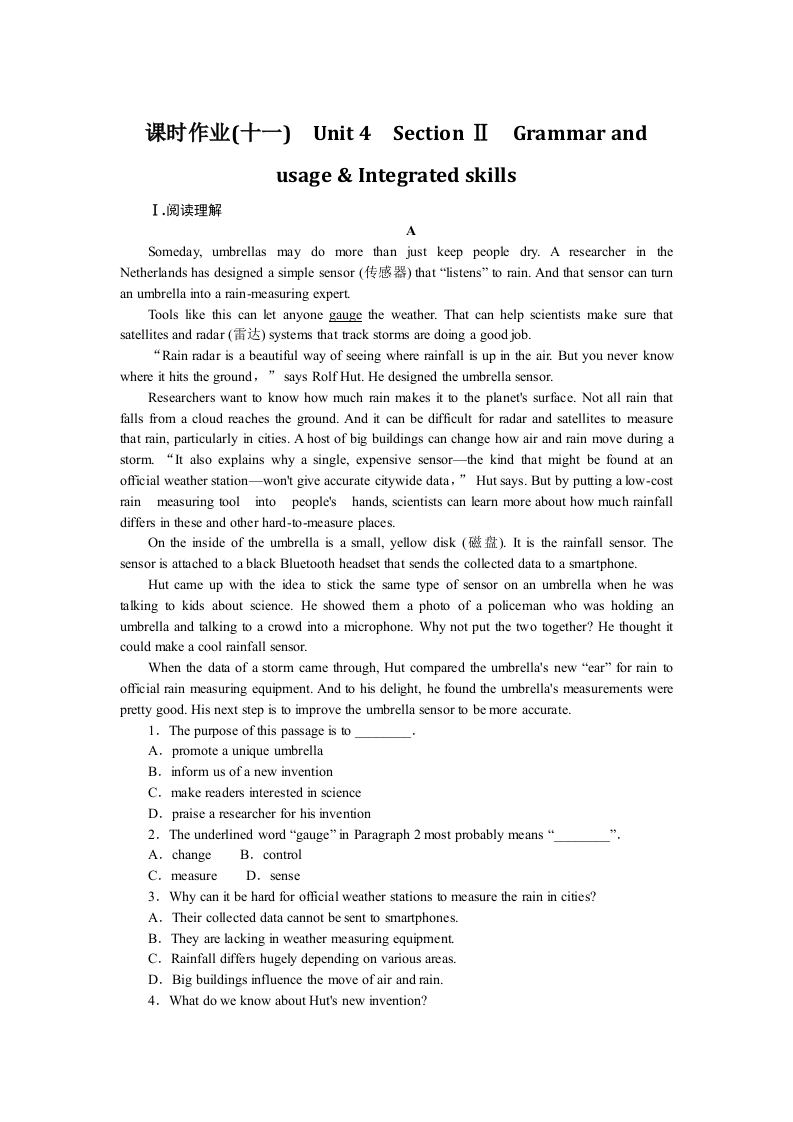 学生啦:课时作业(十一)Unit4 SectionⅡGrammar andusage Integrated skillsI.阅读理解Someday,umbrellas may do more than just keep people dry.A researcher in theNetherlands has designed a simple sensor(传感器)that“listens'”to rain.And that sensor can turnan umbrella into a rain-measuring expert.Tools like this can let anyone gauge the weather.That can help scientists make sure thatsatellites and radar (systems that track storms are doing a good job."Rain radar is a beautiful way of seeing where rainfall is up in the air.But you never knowwhere it hits the ground,says Rolf Hut.He designed the umbrella sensor.Researchers want to know how much rain makes it to the planet's surface.Not all rain thatfalls from a cloud reaches the ground.And it can be difficult for radar and satellites to measurethat rain,particularly in cities.A host of big buildings can change how air and rain move during astorm."It also explains why a single,expensive sensor-the kind that might be found at anofficial weather station-won't give accurate citywide data,"Hut says.But by putting a low-costrain measuring tool into people's hands,scientists can learn more about how much rainfalldiffers in these and other hard-to-measure places.On the inside of the umbrella is a small,yellow disk )It is the rainfall sensor.Thesensor is attached to a black Bluetooth headset that sends the collected data to a smartphone.Hut came up with the idea to stick the same type of sensor on an umbrella when he wastalking to kids about science.He showed them a photo of a policeman who was holding anumbrella and talking to a crowd into a microphone.Why not put the two together?He thought itcould make a cool rainfall sensor.When the data of a storm came through,Hut compared the umbrella's new "ear"for rain toofficial rain measuring equipment.And to his delight,he found the umbrella's measurements werepretty good.His next step is to improve the umbrella sensor to be more accurate.1.The purpose of this passage is toA.promote a unique umbrellaB.inform us of a new inventionC.make readers interested in scienceD.praise a researcher for his invention2.The underlined word“gauge”in Paragraph2 most probably means“”A.change B.controlC.measure D.sense3.Why can it be hard for official weather stations to measure the rain in cities?A.Their collected data cannot be sent to smartphones.B.They are lacking in weather measuring equipment.C.Rainfall differs hugely depending on various areas.D.Big buildings influence the move of air and rain.4.What do we know about Hut's new invention?