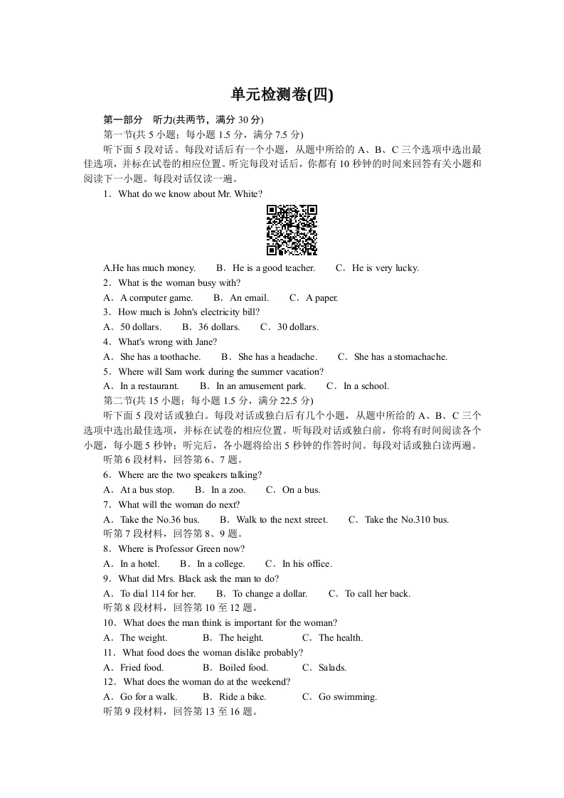 学生啦:单元检测卷(四)第一部分听力(共两节,满分30分)第一节(共5小题:每小题15分,满分7.5分)听下面5段对话。每段对话后有一个小题,从题中所给的A、B、C三个选项中选出最佳选项,并标在试卷的相应位置。听完每段对话后,你都有10秒钟的时间来回答有关小题和阅读下一小题。每段对话仅读一遍。1.What do we know about Mr.White?▣A.He has much money.B.He is a good teacher.C.He is very lucky.2.What is the woman busy with?A.A computer game.B.An email.C.A paper.3.How much is John's electricity bill?A.50 dollars.B.36 dollars.C.30 dollarsA.She has a toothache.B.She has a headache.C.She has a stomachache5.Where will Sam work during the summer vacation?A.In a restaurant.B.In an amusement park.C.In a school.第二节(共15小题:每小题1.5分,满分22.5分)听下面5段对话或独白。每段对话或独白后有几个小题,从题中所给的A、B、C三个选项中选出最佳选项,并标在试卷的相应位置。听每段对话或独白前,你将有时间阅读各个小题,每小题5秒钟:听完后,各小题将给出5秒钟的作答时间。每段对话或独白读两遍。听第6段材料,回答第6、7题。6.Where are the two speakers talking?A.At a bus stop.B.In a zoo.C.On a bus.7.What will the woman do next?A.Take the No.36 bus.B.Walk to the next street.C.Take the No.310 bus.听第7段材料,回答第8、9题。8.Where is Professor Green now?A.In a hotel.B.In a college.C.In his office.9.What did Mrs.Black ask the man to do?A.To dial 114 for her.B.To change a dollar.C.To call her back听第8段材料,回答第10至12题。10.What does the man think is important for the woman?A.The weight.B.The height.C.The health.11.What food does the woman dislike probably?A.Fried food.B.Boiled food.C.Salads.12.What does the woman do at the weekend?A.Go for a walk.B.Ride a bike.C.Go swimming.听第9段材料,回答第13至16题。