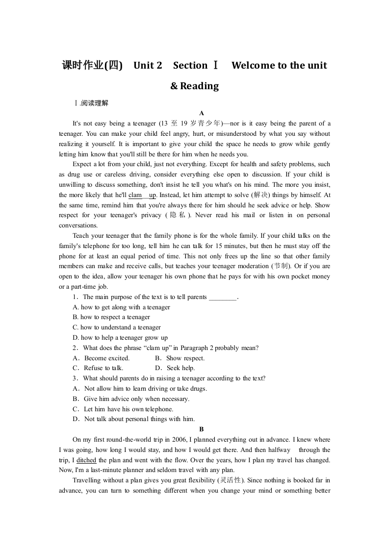 学生啦:课时作业(四)Unit 2 Section I Welcome to the unitReadingIt's not easy being a teenager(l3至l9岁青少年)-nor is it easy being the parent of ateenager.You can make your child feel angry,hurt,or misunderstood by what you say withoutrealizing it yourself.It is important to give your child the space he needs to grow while gentlyletting him know that you'll still be there for him when he needs you.Expect a lot from your child,just not everything.Except for health and safety problems,suchas drug use or careless driving,consider everything else open to discussion.If your child isunwilling to discuss something,don't insist he tell you what's on his mind.The more you insist,the more likely that he'll clam up.Instead,let him attempt to solve (things by himself.Atthe same time,remind him that you're always there for him should he seek advice or help.Showrespect for your teenager's privacy ()Never read his mail or listen in on personalconversations.Teach your teenager that the family phone is for the whole family.If your child talks on thefamily's telephone for too long,tell him he can talk for 15 minutes,but then he must stay off thephone for at least an equal period of time.This not only frees up the line so that other familymembers can make and receive calls,but teaches your teenager moderation ()Or if you areopen to the idea,allow your teenager his own phone that he pays for with his own pocket moneyor a part-time job.1.The main purpose of the text is to tell parentsA.how to get along with a teenagerB.how to respect a teenagerC.how to understand a teenagerD.how to help a teenager grow up2.What does the phrase"clam up"in Paragraph 2 probably mean?A.Become excited.B.Show respect.C.Refuse to talk.D.Seek help.3.What should parents do in raising a teenager according to the text?A.Not allow him to leam driving or take drugs.B.Give him advice only when necessary.C.Let him have his own telephone.D.Not talk about personal things with him.On my first round-the-world trip in 2006,I planned everything out in advance.I knew whereI was going,how long I would stay,and how I would get there.And then halfway through thetrip,I ditched the plan and went with the flow.Over the years,how I plan my travel has changed.Now,I'm a last-minute planner and seldom travel with any plan.Travelling without a plan gives you great flexibility(灵话性),.Since nothing is booked far inadvance,you can turn to something different when you change your mind or something better