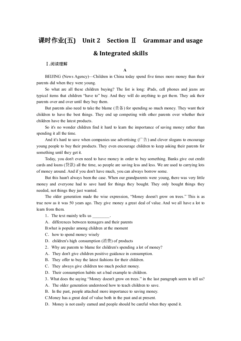 学生啦:课时作业(五)Unit 2 Section II Grammar and usageIntegrated skillsI.阅读理解ABEIJING (News Agency)-Children in China today spend five times more money than theirparents did when they were young.So what are all these children buying?The list is long:iPads,cell phones and jeans aretypical items that children"have to"buy.And they will do anything to get them.They ask theirparents over and over until they buy them.But parents also need to take the blame for spending so much money.They want theirchildren to have the best things.They end up competing with other parents over whether theirchildren have the latest products.So it's no wonder children find it hard to leam the importance of saving money rather thanspending it all the time.And it's hard to save when companies use advertising (and clever slogans to encourageyoung people to buy their products.They even encourage children to keep asking their parents forsomething until they get it.Today,you don't even need to have money in order to buy something.Banks give out creditcards and loans all the time,so people are saving less and less.We are used to carrying lotsof money around.And if you don't have much,you can always borrow some.But this hasn't always been the case.When our grandparents were young,there was very littlemoney and everyone had to save hard for things they bought.They only bought things theyneeded,not things they just wanted.The older generation made the wise expression,"Money doesn't grow on trees."This is astrue now as it was 50 years ago.They give money a great deal of value.And we all have a lot toleam from them.1.The text mainly tells usA.differences between teenagers and their parentsB.what is popular among children at the momentC.how to spend money wiselyD.children's high consumption (of products2.Why are parents to blame for children's spending a lot of money?A.They don't give children positive guidance in consumption.B.They offer to buy the latest fashions for their children.C.They always give children too much pocket money.D.Their consumption habits set a bad example to children.3.What does the saying"Money doesn't grow on trees."in the last paragraph seem to tell us?A.The older generation understood how to teach children to save.B.In the past,people attached more importance to saving money.C.Money has a great deal of value both in the past and at present.D.Money is not easily eamed and people should be careful when they spend it.
