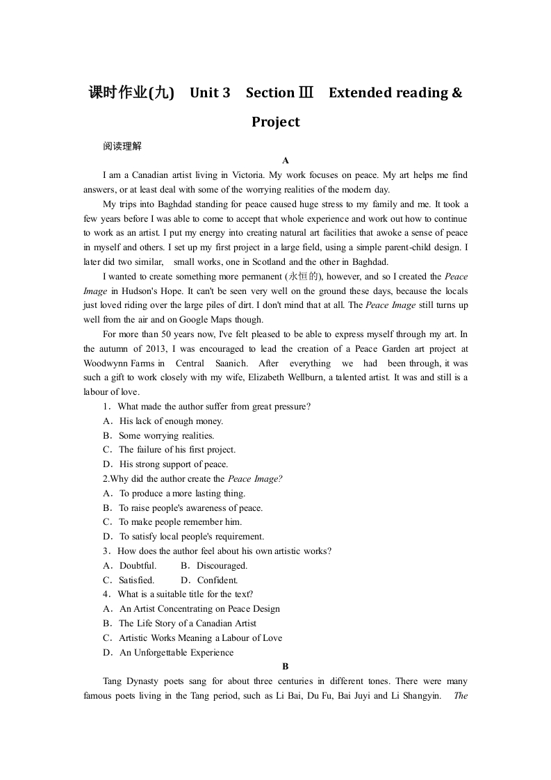 学生啦:课时作业(九)Unit 3 Section III Extended readingProject阅读理解I am a Canadian artist living in Victoria.My work focuses on peace.My art helps me findanswers,or at least deal with some of the worrying realities of the modem day.My trips into Baghdad standing for peace caused huge stress to my family and me.It took afew years before I was able to come to accept that whole experience and work out how to continueto work as an artist.I put my energy into creating natural art facilities that awoke a sense of peacein myself and others.I set up my first project in a large field,using a simple parent-child design.Ilater did two similar,small works,one in Scotland and the other in Baghdad.I wanted to create something more permanent(永▣的),however,and so I created the PeaceImage in Hudson's Hope.It can't be seen very well on the ground these days,because the localsjust loved riding over the large piles of dirt.I don't mind that at all.The Peace Image still turns upwell from the air and on Google Maps though.For more than 50 years now,I've felt pleased to be able to express myself through my art.Inthe autumn of 2013,I was encouraged to lead the creation of a Peace Garden art project atWoodwynn Fars in Central Saanich.After everything we had been through,it wassuch a gift to work closely with my wife,Elizabeth Wellburn,a talented artist.It was and still is alabour of love.1.What made the author suffer from great pressure?A.His lack of enough money.B.Some worrying realities.C.The failure of his first project.D.His strong support of peace.2.Why did the author create the Peace Image?A.To produce a more lasting thing.B.To raise people's awareness of peace.C.To make people remember him.D.To satisfy local people's requirement.3.How does the author feel about his own artistic works?A.Doubtful.B.Discouraged.C.Satisfied.D.Confident.4.What is a suitable title for the text?A.An Artist Concentrating on Peace DesignB.The Life Story of a Canadian ArtistC.Artistic Works Meaning a Labour of LoveD.An Unforgettable ExperienceTang Dynasty poets sang for about three centuries in different tones.There were manyfamous poets living in the Tang period,such as Li Bai,Du Fu,Bai Juyi and Li Shangyin.The