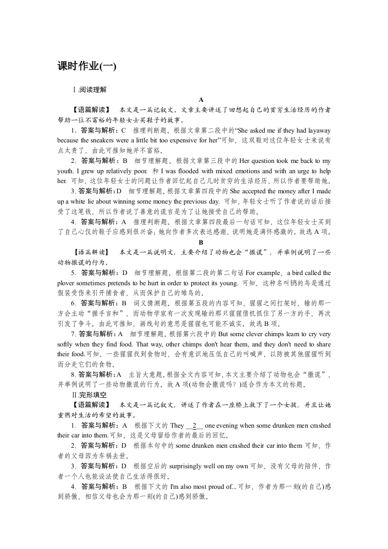 学生啦:课时作业(一)【阅读理解【语篇解读】本文是一篇记叙文。文章主要讲述了回想起自己的贫穷生活经历的作者帮助一位不富裕的年轻女士买鞋子的故事,l.答案与解析:C推理判断题,根据文章第二段中的“She asked me if they had layawaybecause the sneakers were a little bit too expensive for her'”可知,这双鞋对这位年轻女士来说有点太贵了,由此可推知她并不富裕。2.答案与解析:B细节理解题。根据文章第三段中的Her question took me back to myyouth.I grew up relatively poor.I was flooded with mixed emotions and with an urge to helpher可知,这位年轻女士的问题让作者回忆起自己儿时贫穷的生活经历,所以作者要帮助她,3,答案与解析:D细节理解题,根据文章第四段中的She accepted the money after I madeup a white lie about winning some money the previous day..可知,年轻女士听了作者说的话后接受了这笔钱,所以作者说了善意的谎言是为了让她接受自己的帮助。4,答案与解析:A推理判断题。根据文章第四段最后一句话可知,这位年轻女士买到了自己心仪的鞋子应感到很兴奋:她向作者多次表达感谢,说明她是满怀感激的。故选A项。【语篇解读】本文是一篇说明文,主要介绍了动物也会“撤谎”,并举例说明了一些5.答案与解析:D细节理解题。根据第二段的第二句话For example,a bird called theplover sometimes pretends to be hurt in order to protect its young..可知,这种名叫鸻的鸟是通过假装受伤来引开捕食者,从而保护自己的雏鸟的。6.答案与解析:B词义猜测题。根据第五段的内容可知,猩猩之间打架时,输的那一方会主动“握手言和”,而动物学家有一次发现输的那只猩猩借机抓住了另一方的手,再次引发了争斗。由此可推知,画线句的意思是猩猩也可能不诚实。故选B项。7.答案与解析:A细节理解题,根据第六段中的But some clever chimps leam to cry verysoftly when they find food.That way,other chimps don't hear them,and they don't need to sharetheir food.可知,一些猩猩找到食物时,会有意识地压低自己的叫减声,以防被其他猩猩听到而分走它们的食物。8.答案与解析:A主旨大意题,根据全文内容可知,本文主要介绍了动物也会“撒谎”,并举例说明了一些动物撒谎的行为。故A项(动物会撒谎吗?)适合作为本文的标题Ⅱ完形填空【语篇解读】本文是一篇记叙文,讲述了作者在一座桥上救下了一个女孩,并且让她重燃对生活的希望的故事。l.答案与解析:A根据下文的They_2_one evening when some drunken men crashedtheir car into them.可知,这是父母留给作者的最后的回忆,2.答案与解析:D根据本句中的some drunken men crashed their car into them可知,作者的父母因为车祸去世。3.答案与解析:D根据空后的surprisingly well on my own可知,没有父母的陪伴,作者一个人也能设法使自己生活得很好。4.答案与解析:B根据下文的I'm also most proud of.可知,作者为那一刻(的自己)感到骄做,相信父母也会为那一刻(的自己)感到骄做。