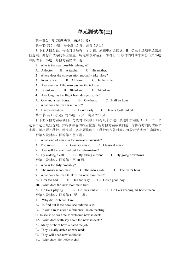 学生啦:单元测试卷(三)第一部分听力(共两节,满分30分)第一节(共5小题:每小题1.5分,满分7.5分)听下面5段对话。每段对话后有一个小题,从题中所给的A、B、C三个选项中选出最佳选项,并标在试卷的相应位置。听完每段对话后,你都有10秒钟的时间来回答有关小题和阅读下一小题。每段对话仅读一遍。1.Who is the man possibly talking to?A.A doctor.B.A teacher.C.His mother.2.Where does the conversation probably take place?A.In an office.B.At home.C.In the street.3.How much will the man pay for the tickets?A.18 dollars.B.30 dollars.C.24 dollars.4.How long has the flight been delayed so far?A.One and a half hours.B.One hour.C.Half an hour.5.What does the man want to do?A.Have a dictation.B.Leave early.C.Have a tooth pulled第二节(共15小题:每小题1.5分,满分22.5分)听下面5段对话或独白,每段对话或独白后有几个小题,从题中所给的A、B、C三个选项中选出最佳选项,并标在试卷的相应位置。听每段对话或独白前,你将有时间阅读各个小题,每小题5秒钟:听完后,各小题将给出5秒钟的作答时间。每段对话或独白读两遍。听第6段材料,回答第6至7题。6.What kind of music is the woman's favourite?A.Pop music.B.Country music.C.Classical music.7.How will the man find out the information?A.By making a call.B.By asking a friend.C.By going downtown听第7段材料,回答第8至10题。8.Who is the lady probably?A.The man's schoolmate.B.The man's wife.C.The man's boss.9.What does the man think of his new roommate?A.He's too bad.B.He's too lazy.C.He's a good boy.10.What does the new roommate like?A.He likes playing.B.He likes music.C.He likes keeping his house clean.听第8段材料,回答第11至13题。11.Why did Ruth call Tim?A.To find out if the book she ordered is in.B.To ask him to attend a Students'Union meeting.C.To see if he has time to welcome new students.12.What does Ruth say about the new students?A.Many of them have a part-time job.B.They usually arrive on weekends.C.They will need new textbooks.13.What does Tim offer to do?