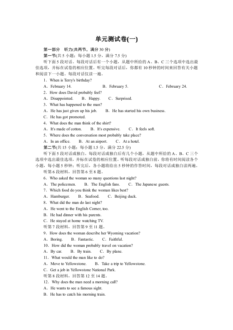 学生啦:单元测试卷(一)第一部分听力(共两节,满分30分)第一节(共5小题:每小题1.5分,满分7.5分)听下面5段对话。每段对话后有一个小题,从题中所给的A、B、C三个选项中选出最佳选项,并标在试卷的相应位置。听完每段对话后,你都有10秒钟的时间来回答有关小题和阅读下一小题。每段对话仅读一遍。1.When is Terry's birthday?A.February 14.B.February 5.C.February 24.2.How does David probably feel?A.Disappointed.B.Happy.C.Surprised.3.What has happened to the man?A.He has just given up his job.B.He has started his own business.C.He has got promoted.4.What does the man think of the shirt?A.It's made of cotton.B.It's expensive.C.It feels soft.5.Where does the conversation most probably take place?A.In an office.B.At an airport.C.At a hotel.第二节(共15小题:每小题1.5分,满分22.5分)听下面5段对话或独白。每段对话或独白后有几个小题,从题中所给的A、B、C三个选项中选出最佳选项,并标在试卷的相应位置。听每段对话或独白前,你将有时间阅读各个小题,每小题5秒钟:听完后,各小题将给出5秒钟的作答时间,每段对话或独白读两遍。听第6段材料,回答第6至8题。6.Who asked the woman so many questions last night?A.The policemen.B.The English fans.C.The Japanese guests.7.Which food do you think the woman likes best?A.Hamburger.B.Seafood.C.Beijing duck.8.What did the man do last night?A.He went to the English Comer,too.B.He had dinner with his parentsC.He stayed at home watching TV.听第7段材料,回答第9至11题。9.How does the woman describe her Wyoming vacation?A.Boring.B.Fantastic.C.Faithful.10.How did the woman probably travel on vacation?A.By car.B.By train.C.By plane.11.What would the man like to do?A.Move to Yellowstone.B.Take a trip to Yellowstone.C.Get a job in Yellowstone National Park.听第8段材料,回答第12至14题。12.Why does the man need a morning call?A.He wants to see a famous sight.B.He has to catch his morning train.