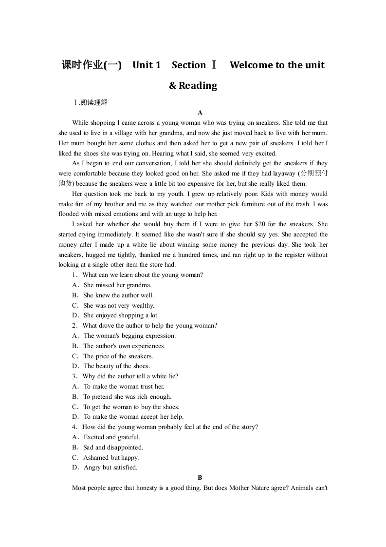 学生啦:课时作业(一Unit 1 Section I Welcome to the unitReadingWhile shopping I came across a young woman who was trying on sneakers.She told me thatshe used to live in a village with her grandma,and now she just moved back to live with her mum.Her mum bought her some clothes and then asked her to get a new pair of sneakers.I told her Iliked the shoes she was trying on.Hearing what I said,she seemed very excited.As I began to end our conversation,I told her she should definitely get the sneakers if theywere comfortable because they looked good on her..She asked me if they had layaway(分期t预付because the sneakers were a little bit too expensive for her,but she really liked them.Her question took me back to my youth.I grew up relatively poor.Kids with money wouldmake fun of my brother and me as they watched our mother pick fumiture out of the trash.I wasflooded with mixed emotions and with an urge to help her.I asked her whether she would buy them if I were to give her $20 for the sneakers.Shestarted crying immediately.It seemed like she wasn't sure if she should say yes.She accepted themoney after I made up a white lie about winning some money the previous day.She took hersneakers,hugged me tightly,thanked me a hundred times,and ran right up to the register withoutlooking at a single other item the store had.1.What can we learn about the young woman?A.She missed her grandma.B.She knew the author well.C.She was not very wealthy.D.She enjoyed shopping a lot.2.What drove the author to help the young woman?A.The woman's begging expression.B.The author's own experiences.C.The price of the sneakers.D.The beauty of the shoes.3.Why did the author tell a white lie?A.To make the woman trust her.B.To pretend she was rich enough.C.To get the woman to buy the shoes.D.To make the woman accept her help.4.How did the young woman probably feel at the end of the story?A.Excited and grateful.B.Sad and disappointed.C.Ashamed but happy.D.Angry but satisfied.BMost people agree that honesty is a good thing.But does Mother Nature agree?Animals can't