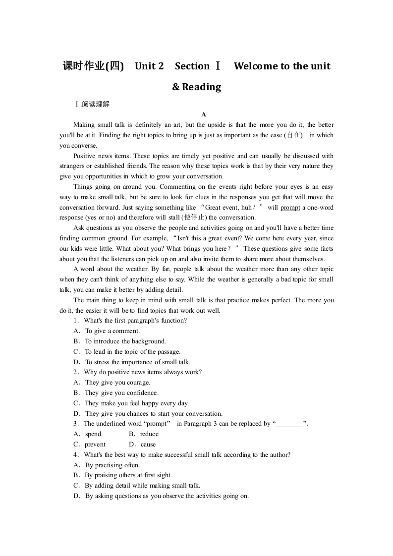 学生啦:课时作业(四)Unit 2 Section I Welcome to the unitReadingMaking small talk is definitely an art,but the upside is that the more you do it,the betteryou'll be at it.Finding the right topics to bring up is just as important as the ease (in whichyou converse.Positive news items.These topics are timely yet positive and can usually be discussed withstrangers or established friends.The reason why these topics work is that by their very nature theygive you opportunities in which to grow your conversation.Things going on around you.Commenting on the events right before your eyes is an easyway to make small talk,but be sure to look for clues in the responses you get that will move theconversation forward.Just saying something like "Great event,huh?"will prompt a one-wordresponse (yes or no)and therefore will stall(使停止)the conversation..Ask questions as you observe the people and activities going on and you'll have a better timefinding common ground.For example,"Isn't this a great event?We come here every year,sinceour kids were little.What about you?What brings you here?These questions give some factsabout you that the listeners can pick up on and also invite them to share more about themselves.A word about the weather.By far,people talk about the weather more than any other topicwhen they can't think of anything else to say.While the weather is generally a bad topic for smalltalk,you can make it better by adding detail.The main thing to keep in mind with small talk is that practice makes perfect.The more youdo it,the easier it will be to find topics that work out well.1.What's the first paragraph's function?A.To give a comment.B.To introduce the background.C.To lead in the topic of the passage.D.To stress the importance of small talk.2.Why do positive news items always work?A.They give you courage.B.They give you confidence.C.They make you feel happy every day.D.They give you chances to start your conversation.3.The underlined word "prompt"in Paragraph 3 can be replaced by"A.spendB.reduceC.preventD.cause4.What's the best way to make successful small talk according to the author?A.By practising often.B.By praising others at first sight.C.By adding detail while making small talk.D.By asking questions as you observe the activities going on.
