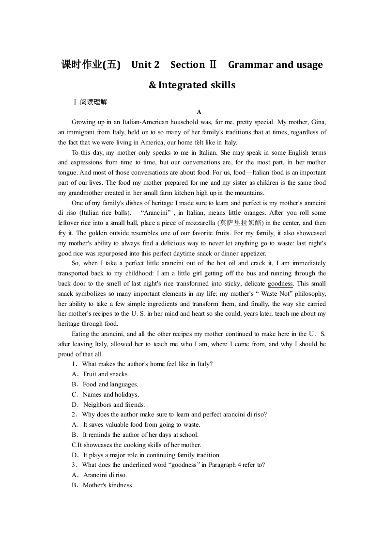 学生啦:课时作业(五)Unit 2 Section II Grammar and usageIntegrated skillsGrowing up in an Italian-American household was,for me,pretty special.My mother,Gina,an immigrant from Italy,held on to so many of her family's traditions that at times,regardless ofthe fact that we were living in America,our home felt like in Italy.To this day,my mother only speaks to me in Italian.She may speak in some English termsand expressions from time to time,but our conversations are,for the most part,in her mothertongue.And most of those conversations are about food.For us,food-Italian food is an importantpart of our lives.The food my mother prepared for me and my sister as children is the same foodmy grandmother created in her small farm kitchen high up in the mountains.One of my family's dishes of heritage I made sure to leam and perfect is my mother's arancinidi riso (Italian rice balls)."Arancini",in Italian,means little oranges.After you roll someleftover rice into a small ball,place a piece of mozzarella(莫萨里拉奶酪)in the center,.and thenfry it.The golden outside resembles one of our favorite fruits.For my family,it also showcasedmy mother's ability to always find a delicious way to never let anything go to waste:last night'sgood rice was repurposed into this perfect daytime snack or dinner appetizer.So,when I take a perfect little arancini out of the hot oil and crack it,I am immediatelytransported back to my childhood:I am a little girl getting off the bus and running through theback door to the smell of last night's rice transformed into sticky,delicate goodness.This smallsnack symbolizes so many important elements in my life:my mother's"Waste Not"philosophy,her ability to take a few simple ingredients and transform them,and finally,the way she carriedher mother's recipes to the U.S.in her mind and heart so she could,years later,teach me about myheritage through food.Eating the arancini,and all the other recipes my mother continued to make here in the U.S.after leaving Italy,allowed her to teach me who I am,where I come from,and why I should beproud of that all.1.What makes the author's home feel like in Italy?A.Fruit and snacks.B.Food and languages.C.Names and holidays.D.Neighbors and friends.2.Why does the author make sure to leam and perfect arancini di riso?A.It saves valuable food from going to waste.B.It reminds the author of her days at school.C.It showcases the cooking skills of her mother.D.It plays a major role in continuing family tradition.3.What does the underlined word "goodness"in Paragraph 4 refer to?A.Arancini di riso.B.Mother's kindness.