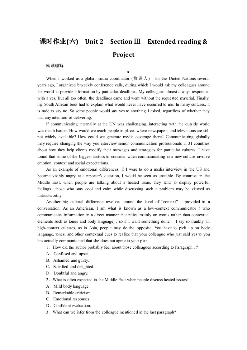 学生啦:课时作业(六)Unit2 SectionⅢlExtended readingProject阅读理解When I worked as a global media coordinator (for the United Nations severalyears ago,I organized biweekly conference calls,during which I would ask my colleagues aroundthe world to provide information by particular deadlines.My colleagues almost always respondedwith a yes.But all too often,the deadlines came and went without the requested material.Finally,my South African boss had to explain what would never have occurred to me:In many cultures,itis rude to say no.So some people would say yes to anything I asked,regardless of whether theyhad any intention of delivering.If communicating internally at the UN was challenging,interacting with the outside worldwas much harder.How would we reach people in places where newspapers and televisions are stillnot widely available?How could we generate media coverage there?Communicating globallymay require changing the way you interview senior communication professionals in 31 countriesabout how they help clients modify their messages and strategies for particular cultures.I havefound that some of the biggest factors to consider when communicating in a new culture involveemotion,context and social expectations.As an example of emotional differences,if I were to do a media interview in the US andbecame visibly angry at a reporter's question,I would be seen as unstable.By contrast,in theMiddle East,when people are talking about a heated issue,they tend to display powerfulfeelings-those who stay cool and calm while discussing such a problem may be viewed asAnother big cultural difference revolves around the level of "context"provided in aconversation.As an American,I am what is known as a low-context communicator whocommunicates information in a direct manner that relies mainly on words rather than contextualelements such as tones and body language),so if I want something done,I say so frankly.Inhigh-context cultures,as in Asia,people may do the opposite.You have to pick up on bodylanguage,tones,and other contextual cues to realize that your colleague who just said yes to youhas actually communicated that she does not agree to your plan.1.How did the author probably feel about those colleagues according to Paragraph 1?A.Confused and upset.B.Ashamed and guilty.C.Satisfied and delighted.D.Doubtful and angry.2.What is often expected in the Middle East when people discuss heated issues?A.Mild body language.B.Remarkable criticism.C.Emotional responses.D.Confident evaluation.3.What can we infer from the colleague mentioned in the last paragraph?