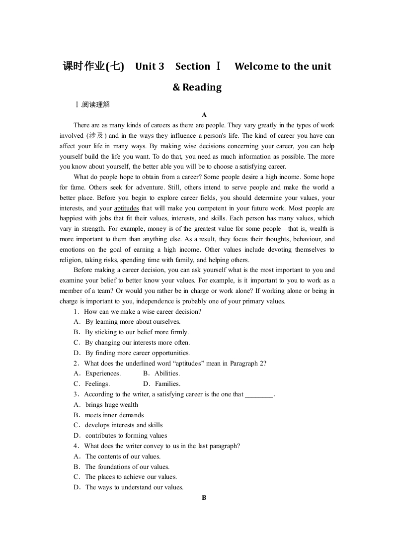 学生啦:课时作业(七)Unit 3 Section I Welcome to the unitReadingThere are as many kinds of careers as there are people.They vary greatly in the types of workinvolved (and in the ways they influence a person's life.The kind of career you have canaffect your life in many ways.By making wise decisions concerning your career,you can helpyourself build the life you want.To do that,you need as much information as possible.The moreyou know about yourself,the better able you will be to choose a satisfying career.What do people hope to obtain from a career?Some people desire a high income.Some hopefor fame.Others seek for adventure.Still,others intend to serve people and make the world abetter place.Before you begin to explore career fields,you should determine your values,yourinterests,and your aptitudes that will make you competent in your future work.Most people arehappiest with jobs that fit their values,interests,and skills.Each person has many values,whichvary in strength.For example,money is of the greatest value for some people-that is,wealth ismore important to them than anything else.As a result,they focus their thoughts,behaviour,andemotions on the goal of earning a high income.Other values include devoting themselves toreligion,taking risks,spending time with family,and helping others.Before making a career decision,you can ask yourself what is the most important to you andexamine your belief to better know your values.For example,is it important to you to work as amember of a team?Or would you rather be in charge or work alone?If working alone or being incharge is important to you,independence is probably one of your primary values.1.How can we make a wise career decision?A.By leaming more about ourselves.B.By sticking to our belief more firmly.C.By changing our interests more often.D.By finding more career opportunities.2.What does the underlined word "aptitudes"mean in Paragraph 2?A.Experiences.B.Abilities.C.Feelings.D.Families.3.According to the writer,a satisfying career is the one thatA.brings huge wealthB.meets inner demandsC.develops interests and skillsD.contributes to forming values4.What does the writer convey to us in the last paragraph?A.The contents of our values.B.The foundations of our values.C.The places to achieve our values.D.The ways to understand our values.