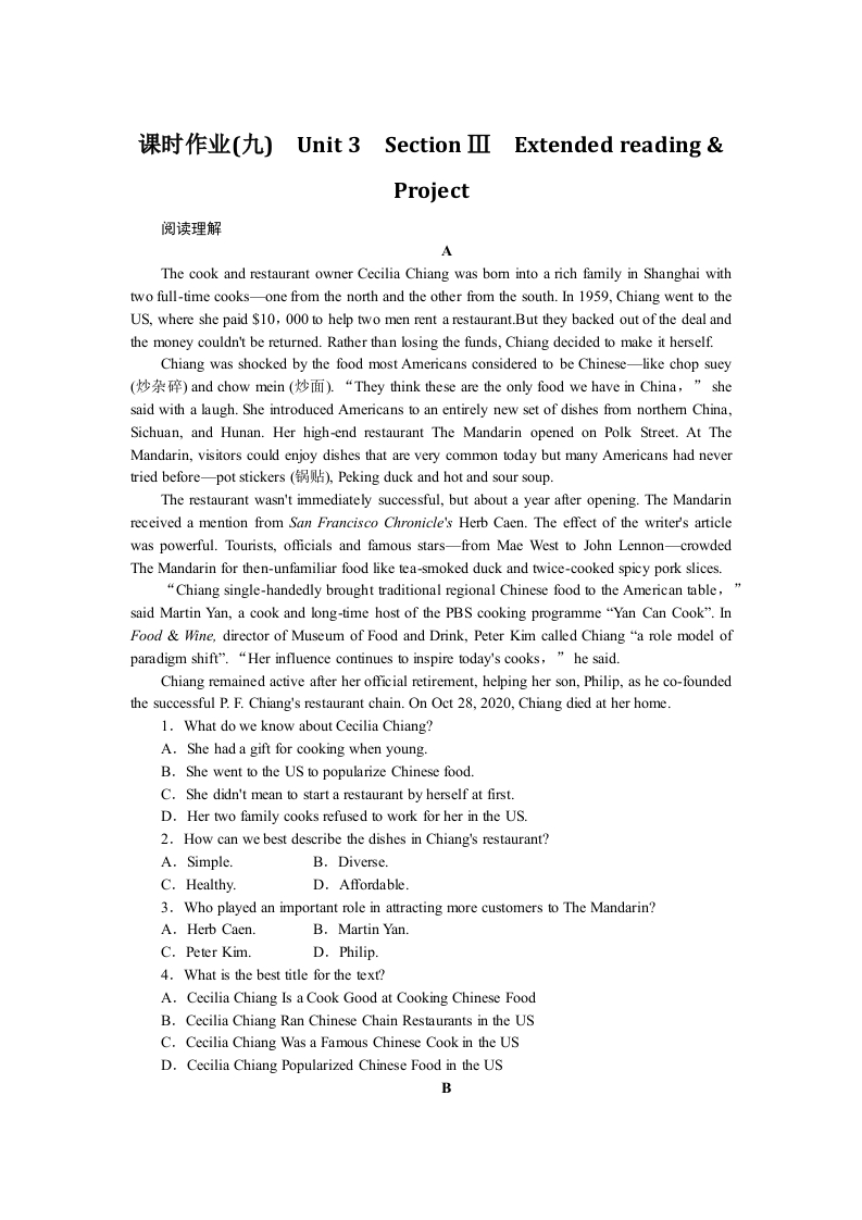 学生啦:课时作业(九)Unit 3 Section III Extended readingProject阅读理解The cook and restaurant owner Cecilia Chiang was bom into a rich family in Shanghai withtwo full-time cooks-one from the north and the other from the south.In 1959,Chiang went to theUS,where she paid $10,000 to help two men rent a restaurant.But they backed out of the deal andthe money couldn't be returned.Rather than losing the funds,Chiang decided to make it herself.Chiang was shocked by the food most Americans considered to be Chinese-like chop suey(炒杂碎)and chow mein(炒面).“They think these are the only food we have in China,”shesaid with a laugh.She introduced Americans to an entirely new set of dishes from northem China,Sichuan,and Hunan.Her high-end restaurant The Mandarin opened on Polk Street.At TheMandarin,visitors could enjoy dishes that are very common today but many Americans had nevertried before-一pot stickers(锅贴,Peking duck and hot and sour soup.The restaurant wasn't immediately successful,but about a year after opening.The Mandarinreceived a mention from San Francisco Chronicle's Herb Caen.The effect of the writer's articlewas powerful.Tourists,officials and famous stars-from Mae West to John Lennon-crowdedThe Mandarin for then-unfamiliar food like tea-smoked duck and twice-cooked spicy pork slices."Chiang single-handedly brought traditional regional Chinese food to the American table,said Martin Yan,a cook and long-time host of the PBS cooking programme"Yan Can Cook".InFood Wine,director of Museum of Food and Drink,Peter Kim called Chiang"a role model ofparadigm shift"."Her influence continues to inspire today's cooks,he said.Chiang remained active after her official retirement,helping her son,Philip,as he co-foundedthe successful P.F.Chiang's restaurant chain.On Oct 28,2020,Chiang died at her home.1.What do we know about Cecilia Chiang?A.She had a gift for cooking when youngB.She went to the US to popularize Chinese food.C.She didn't mean to start a restaurant by herself at first.D.Her two family cooks refused to work for her in the US.2.How can we best describe the dishes in Chiang's restaurant?A.Simple.B.Diverse.C.Healthy.D.Affordable.3.Who played an important role in attracting more customers to The Mandarin?A.Herb Caen.B.Martin Yan.C.Peter Kim.D.Philip.4.What is the best title for the text?A.Cecilia Chiang Is a Cook Good at Cooking Chinese FoodB.Cecilia Chiang Ran Chinese Chain Restaurants in the USC.Cecilia Chiang Was a Famous Chinese Cook in the USD.Cecilia Chiang Popularized Chinese Food in the US