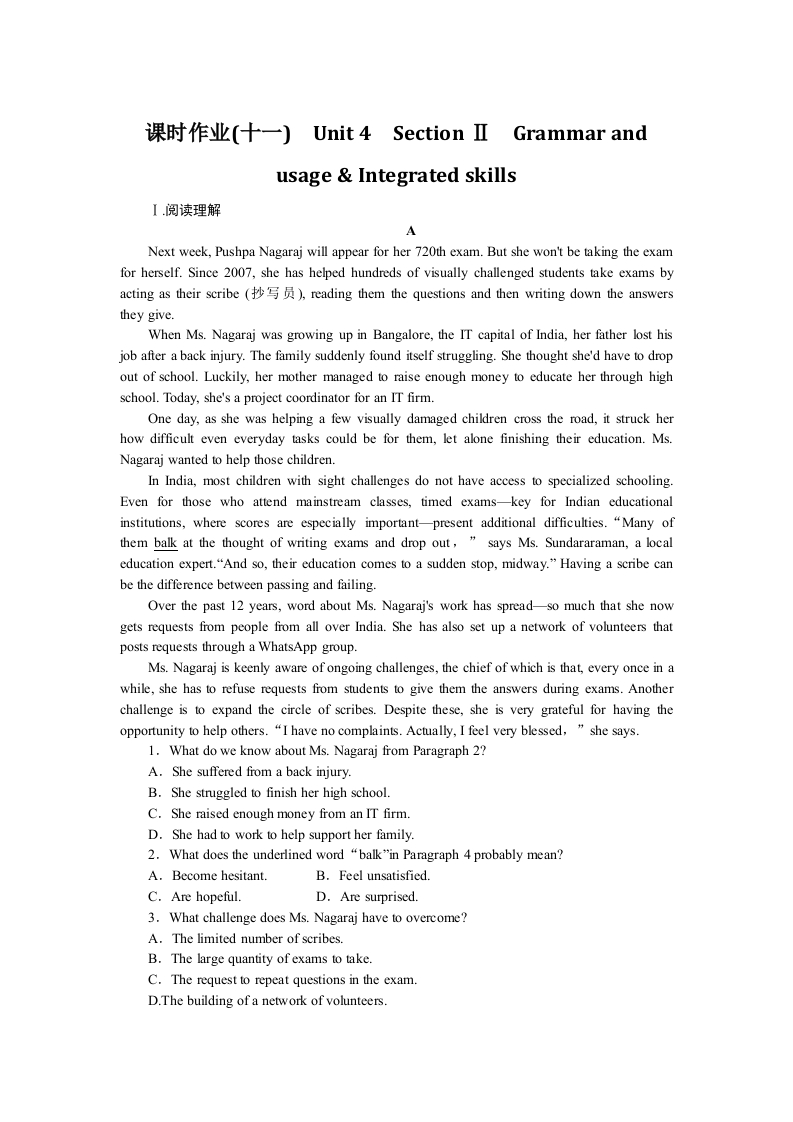 学生啦:课时作业(十一)Unit4 SectionⅡGrammar andusage Integrated skillsNext week,Pushpa Nagaraj will appear for her 720th exam.But she won't be taking the examfor herself.Since 2007,she has helped hundreds of visually challenged students take exams byacting as their scribe(抄写员),reading them the questions and then writing down the answersthey give.When Ms.Nagaraj was growing up in Bangalore,the IT capital of India,her father lost hisjob after a back injury.The family suddenly found itself struggling.She thought she'd have to dropout of school.Luckily,her mother managed to raise enough money to educate her through highschool.Today,she's a project coordinator for an IT firm.One day,as she was helping a few visually damaged children cross the road,it struck herhow difficult even everyday tasks could be for them,let alone finishing their education.Ms.Nagaraj wanted to help those children.In India,most children with sight challenges do not have access to specialized schooling.Even for those who attend mainstream classes,timed exams-key for Indian educationalinstitutions,where scores are especially important-present additional difficulties."Many ofthem balk at the thought of writing exams and drop out,"says Ms.Sundararaman,a localeducation expert."And so,their education comes to a sudden stop,midway."Having a scribe canbe the difference between passing and failing.Over the past 12 years,word about Ms.Nagaraj's work has spread-so much that she nowgets requests from people from all over India.She has also set up a network of volunteers thatposts requests through a WhatsApp group.Ms.Nagaraj is keenly aware of ongoing challenges,the chief of which is that,every once in awhile,she has to refuse requests from students to give them the answers during exams.Anotherchallenge is to expand the circle of scribes.Despite these,she is very grateful for having theopportunity to help others."I have no complaints.Actually,I feel very blessed,she says.1.What do we know about Ms.Nagaraj from Paragraph 2?A.She suffered from a back injury.B.She struggled to finish her high school.C.She raised enough money from an IT firm.D.She had to work to help support her family.2.What does the underlined word "balk"in Paragraph 4 probably mean?A.Become hesitant.B.Feel unsatisfied.C.Are hopeful.D.Are surprised.3.What challenge does Ms.Nagaraj have to overcome?A.The limited number of scribes.B.The large quantity of exams to take.C.The request to repeat questions in the exam.D.The building of a network of volunteers.