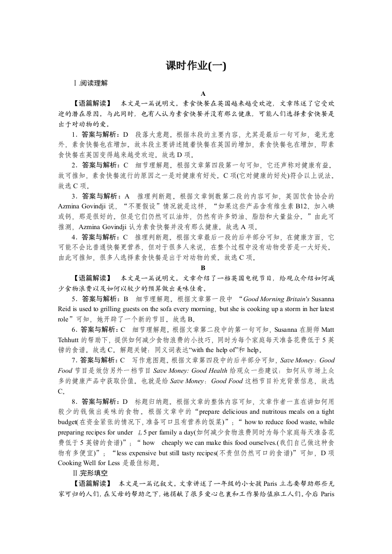 学生啦:课时作业(一)I阅读理解A【语篇解读】本文是一篇说明文。素食快餐在英回越来越受欢迎,文章陈述了它受欢迎的潜在原因。与此同时,也有人认为素食快餐并没有那么健康,可能人们选择素食快餐是出于对动物的爱。1.答案与解析:D段落大意题。根据本段的主要内容,尤其是最后一句可知,毫无意外,素食快餐也在增加。故本段主要讲述随着快餐在英国的增加,素食快餐也在增加,即素食快餐在英国变得越来越受欢迎。故选D项。2.答案与解析:C细节理解题。根据文章第四段第一句可知,它还声称对健康有益。故可推知,素食快餐流行的原因之一是对健康有好处。C项(它对健康的好处)符合以上说法。3.答案与解析:A推理判断题。根据文章倒数第二段的内容可知,英国饮食协会的Azmina Govindji说,“不要假设”情况就是这样,“如果这些产品含有维生素Bl2、加入碘或钙,那是很好的。但是它们仍然可以油炸,仍然有许多奶油、脂肪和大量盐分。”由此可推测,Azmina Govindji认为素食快餐并没有那么健康。故选A项。4.答案与解析:C推理判断题。根据文章最后一段的后半部分可知,在健康方面,它可能不会比普通快餐更营养,但对于很多人来说,在整个过程中没有动物受苦是一大好处。由此可推知,很多人选择素食快餐是出于对动物的爱。故选C项。B【语篇解读】本文是一篇说明文,文幸介绍了一档英国电视节目,给观众介绍如何减少食物浪费以及如何以较少的预算做出美味佳肴。5.答案与解析:B细节理解题,根据文章第一段中“Good Morning Britain's SusannaReid is used to grilling guests on the sofa every morning,but she is cooking up a storm in her latestrole”可知,她开辟了一个新的节目。故选B。6.答案与解析:C细节理解题。根据文章第二段中的第一句可知,Susanna在厨师MatTehhutt的帮助下,提供如何减少食物浪费的小技巧,同时为每个家庭每天准备花费低于5英镑的食谱。故选C。解题关键:同义词表达“with the help of和hep,7.答案与解析:C写作意图题。根据文章第四段中的后半部分可知,Save Money:GoodFood节目是效仿另外一档节目Save Money:Good Health给观众一些建议:如何从市场上众多的健康产品中获取价值。也就是给Save Money:Good Food这档节目补充背景信息,故选8.答案与解析:D标题归纳题。根据文章的整体内容可知,文章作者一直在讲如何用较少的钱做出美味的食物,根据文章中的“prepare delicious and nutritous meals on a tightbudget(在资金紧张的情况下,准备可口且有营养的饭菜)”;“how to reduce food waste,whilepreparing recipes for under王5 per family a day(如何减少食物浪费同时为每个家庭每天准备花费低于5英镑的食谱)”;“how cheaply we can make this food ourselves.(我们自己做这种食物有多便宜)”;“less expensive but still tasty recipes(不贵但仍然可口的食谱)”可知,D项Cooking Well for Less是最佳标题,Ⅱ完形填空【语篇解读】本文是一篇记叙文,文幸讲述了一年级的小女孩Ps立志要帮助那些无家可归的人们,在父母的帮助之下,她捐献了很多爱心色裹和工作餐给值班工人们,今后Pais
