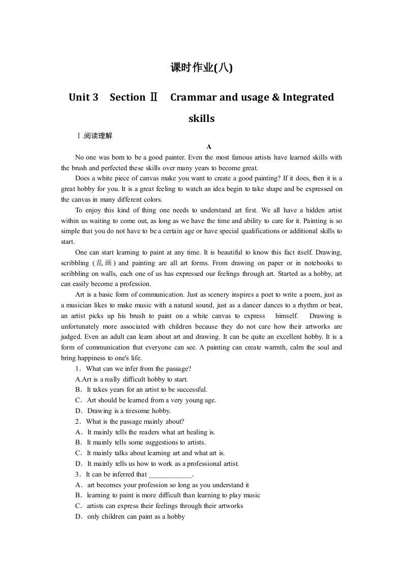 学生啦:课时作业(八)Unit 3SectionⅡCrammar and usage IntegratedskillsANo one was bom to be a good painter.Even the most famous artists have learned skills withthe brush and perfected these skills over many years to become great.Does a white piece of canvas make you want to create a good painting?If it does,then it is agreat hobby for you.It is a great feeling to watch an idea begin to take shape and be expressed onthe canvas in many different colors.To enjoy this kind of thing one needs to understand art first.We all have a hidden artistwithin us waiting to come out,as long as we have the time and ability to care for it.Painting is sosimple that you do not have to be a certain age or have special qualifications or additional skills tostart.One can start leaming to paint at any time.It is beautiful to know this fact itself.Drawing,scribbling (and painting are all art forms.From drawing on paper or in notebooks toscribbling on walls,each one of us has expressed our feelings through art.Started as a hobby,artcan easily become a profession.Art is a basic form of communication.Just as scenery inspires a poet to write a poem,just asa musician likes to make music with a natural sound,just as a dancer dances to a rhythm or beat,an artist picks up his brush to paint on a white canvas to express himself.Drawing isunfortunately more associated with children because they do not care how their artworks arejudged.Even an adult can leam about art and drawing.It can be quite an excellent hobby.It is aform of communication that everyone can see.A painting can create warmth,calm the soul andbring happiness to one's life.1.What can we infer from the passage?A.Art is a really difficult hobby to start.B.It takes years for an artist to be successful.C.Art should be leamed from a very young age.D.Drawing is a tiresome hobby.2.What is the passage mainly about?A.It mainly tells the readers what art healing is.B.It mainly tells some suggestions to artists.C.It mainly talks about leaming art and what art is.D.It mainly tells us how to work as a professional artist.3.It can be inferred thatA.art becomes your profession so long as you understand itB.leaming to paint is more difficult than learning to play musicC.artists can express their feelings through their artworksD.only children can paint as a hobby