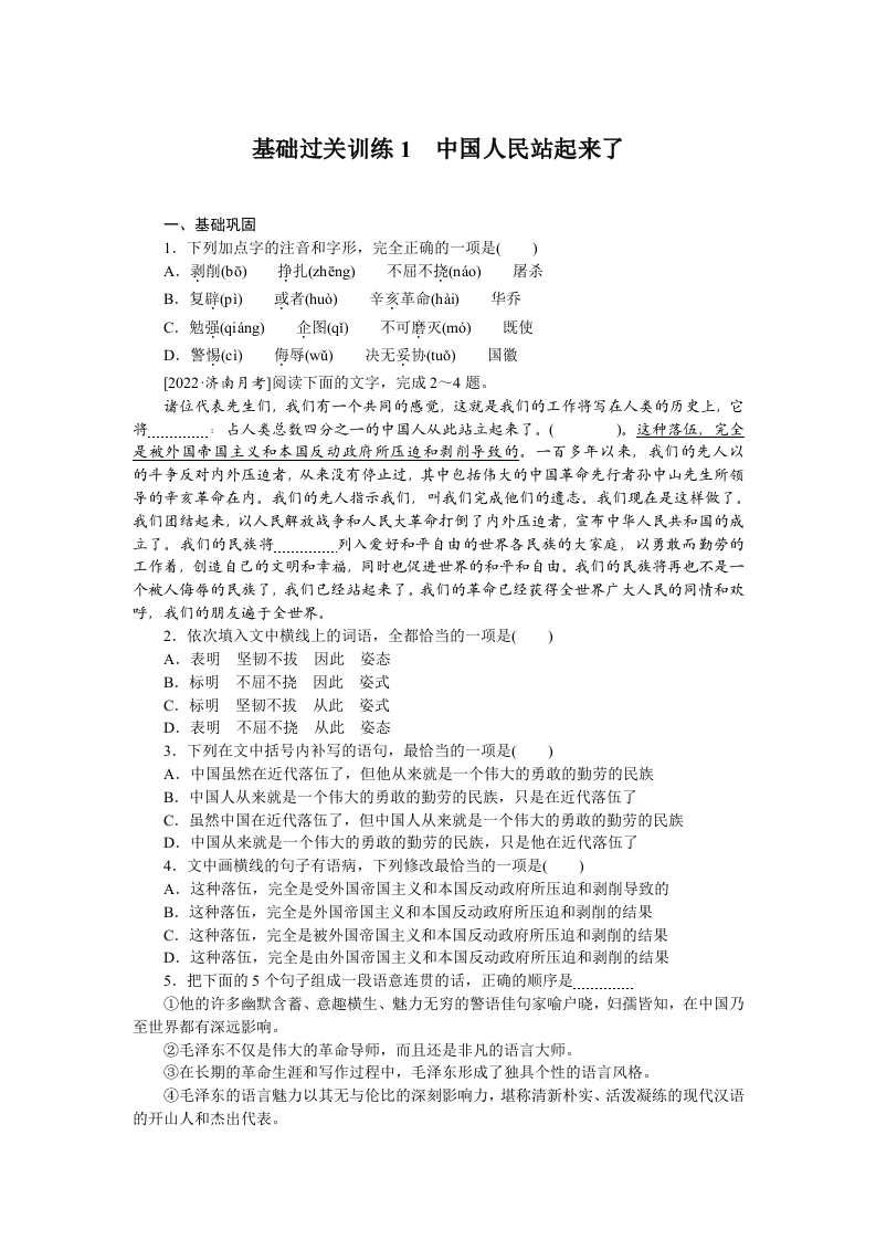 学生啦:基础过关训练1中国人民站起来了一、基础巩固1.下列加点字的注音和字形,完全正确的一项是()挣扎(zheng)不屈不挠(no)屠杀辛亥革命h的华乔C.勉强(qing)企图(q)D.警惕(ci)[2022济南月考]阅读下面的文字,完成2~4题。诺位代表先生们,我们有一个共同的感觉,这就是我们的工作将写在人类的历史上,它:占人类总数四分之一的中国人从此站立起来了,()。这种落伍,完全是被外国帝国主义和本国反动政府所压迫和剥削导致的。一百多年以来,我们的先人以的斗争反对内外压迫者,从来没有停止过,其中包括伟大的中国苹命先行者孙中山先生所领导的辛亥苹命在内。我们的先人指示我们,叫我们完成他们的遗志。我们现在是这样做了。我们团结起来,以人民解放战争和人民大苹命打倒了内外压迫者,宣布中华人民共和国的成立了。我们的民族将列入爱好和平自由的世界各民族的大家庭,以勇敢而勤劳的工作着,创造自己的文明和幸福,同时也促进世界的和平和自由。我们的民族将再也不是一个被人侮辱的民族了,我们已经站起来了。我们的苹命已经获得全世界广大人民的同情和欢呼,我们的朋友遍于全世界。2.依次填入文中横线上的词语,全都恰当的一项是()A.表明坚韧不拔因此姿态B.标明不屈不挠因此姿式C.标明坚韧不拔从此姿式D.表明不屈不挠从此姿态3.下列在文中括号内补写的语句,最恰当的一项是()A,中国虽然在近代落伍了,但他从来就是一个伟大的勇敢的勤劳的民族B.中国人从来就是一个伟大的勇敢的勤劳的民族,只是在近代落伍了C.虽然中国在近代落伍了,但中国人从来就是一个伟大的勇敢的勤劳的民族D.中国从来就是一个伟大的勇敢的勤劳的民族,只是他在近代落伍了4.文中画横线的句子有语病,下列修改最恰当的一项是(A,这种落伍,完全是受外国帝国主义和本国反动政府所压迫和剥削导致的B.这种落伍,完全是外国帝国主义和本国反动政府所压迫和剥削的结果C.这种落伍,完全是被外国帝国主义和本国反动政府所压迫和剥削的结果D.这种落伍,完全是由外国帝国主义和本国反动政府所压迫和剥削的结果5.把下面的5个句子组成一段语意连贯的话,正确的顺序是①他的许多幽默含蓄、意趣横生、魅力无穷的警语佳句家喻户晓,妇孺皆知,在中国乃至世界都有深远影向。②毛泽东不仅是伟大的革命导师,而且还是非凡的语言大师③在长期的革命生涯和写作过程中,毛泽东形成了独具个性的语言风格。④毛泽东的语言魅力以其无与伦比的深刻影响力,堪称清新朴实、活泼凝练的现代汉语的开山人和杰出代表。