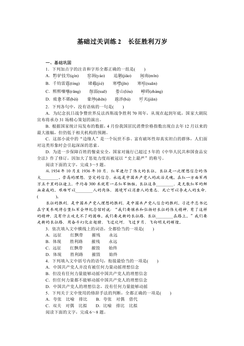 学生啦:基础过关训练2长征胜利万岁一、基础巩固1.下列加点字的注音和字形全都正确的一组是(窑洞yo)B.千钧雷霆(ting)堵截Gi)寒喧(xuan)C.熙熙嚷嚷(rng)嶂碍(zhang)D.疲惫不堪b豪绅(shn)跋涉(b)歼灭Gian)2.下列各句中,没有语病的一句是()A.为纪念抗日战争暨世界反法西斯战争胜利70周年,从现在起到年底,国家大剧院宣布将承办31场精心策划的演出。B.根据国家统计局发布的数据,4月份我国居民消费价格指数出现自去年12月以来的最大涨幅,但仍低于相关机构的预测。C.这部小说中的“边缘人”是一个玩世不恭、富有破坏性却真实坦白的群体,人们面对这类形象时会引起深深的思索。D.为进一步保障百姓的餐桌安全,国家对施行己超过5年的《中华人民共和国食品安全法》作了修订,因加大了惩处力度而被冠以“史上最严”的称号。阅读下面的文字,完成3一5题。从1934年10月至1936年10月,红军进行了伟大的长征。长征是一次理想信念的伟大。崇高的理想,坚定的信念,永远是中国共产党人的政治灵魂。在红一方面军两万五千里的征途上,平均每300米就有一名红军牺壮。长征这条.是无数红军的鲜血染成的。艰难可以人的肉体,图境可以消磨人的意志,死亡可以夺走人的生命,长征的胜利,是中国共产党人理想的胜利,是中国共产党人信念的胜利。习近平总书记在宁夏参观将台堡红军会师纪念馆时说:“我们要继承和弘扬好长征的伟大精神,有了这样的精神,没有什么攻克不了的图难。我们要走新的长征路,长征在路上。”我们要走新的长征路,用奋斗幻化出翅膀,飞过坎坷,飞过岁月,飞向明天的辉煌。3.依次填入文中横线上的词语,全都恰当的一项是()A.远征红飘带摧残永远B.体现胜利路摧残永远C.远征红飘带摧毁始终D.体现胜利路摧毁始终4.下列填入文中括号内的语句,衔接最恰当的一项是()A,中国共产党人并没有被任何力量动摇理想信念B.但没有任何力量能够动摇中国共产党人的理想信念C.但任何力量都不能够动摇中国共产党人的理想信念D.中国共产党人的理想信念,没有任何力量能够动摇5.下列关于文中使用的修辞手法的判断,全都正确的一项是()A.夸张比喻排比B.夸张对偶借代C.双关对偶比拟D.比喻排比比拟阅读下面的文字,完成6一8题。