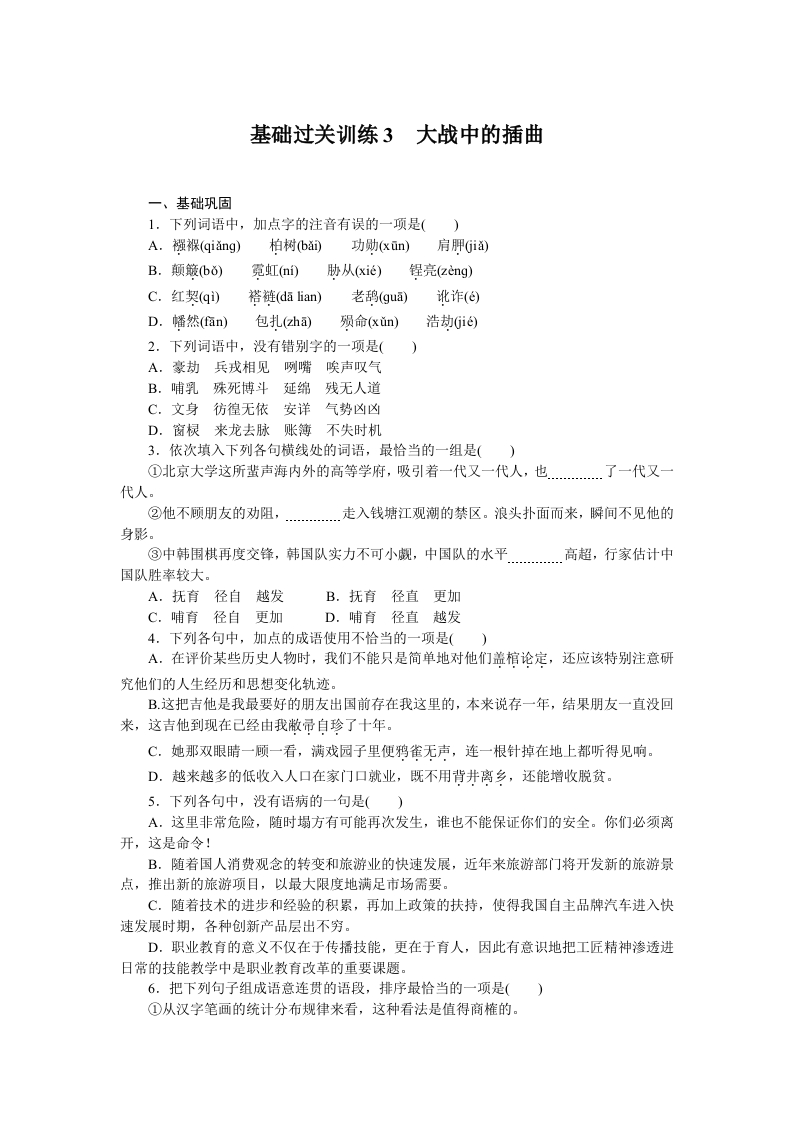学生啦:基础过关训练3大战中的插曲一、基础巩固1.下列词语中,加点字的注音有误的一项是()A.C.红契(qi)褡链(da lian)老鸹(gua)D.幡然(n)浩劫Gie2.下列词语中,没有错别字的一项是(A,豪劫兵戎相见咧嘴唉声叹气B.哺乳殊死博斗延绵残无人道C.文身彷徨无依安详气势凶凶D.窗棂来龙去脉账簿不失时机3.依次填入下列各句横线处的词语,最恰当的一组是()①北京大学这所蜚声海内外的高等学府,吸引着一代又一代人,也了一代又一代人。②他不顾朋友的劝阻,走入钱塘江观潮的禁区。浪头扑面而来,瞬间不见他的身影。③中韩围棋再度交锋,韩国队实力不可小觑,中国队的水平.高超,行家估计中国队胜率较大。A.抚育径自越发B.抚育径直更加C.哺育径自更加D.哺育径直越发4.下列各句中,加点的成语使用不恰当的一项是()A.在评价某些历史人物时,我们不能只是简单地对他们盖棺论定,还应该特别注意研究他们的人生经历和思想变化轨迹。B.这把吉他是我最要好的朋友出国前存在我这里的,本来说存一年,结果朋友一直没回来,这吉他到现在已经由我敝帚自珍了十年。C.她那双眼睛一顾一看,满戏园子里便鸦雀无声,连一根针掉在地上都听得见响。D.越来越多的低收入人口在家门口就业,既不用背井离乡,还能增收脱贫。5.下列各句中,没有语病的一句是()A.这里非常危险,随时塌方有可能再次发生,谁也不能保证你们的安全。你们必须离开,这是命令!B.随着国人消费观念的转变和旅游业的快速发展,近年来旅游部门将开发新的旅游景点,推出新的旅游项目,以最大限度地满足市场需要。C.随着技术的进步和经验的积累,再加上政策的扶持,使得我国自主品牌汽车进入快速发展时期,各种创新产品层出不穷。D.职业教育的意义不仅在于传播技能,更在于育人,因此有意识地把工匠精神渗透进日常的技能教学中是职业教育改革的重要课题。6.把下列句子组成语意连贯的语段,排序最恰当的一项是()①从汉字笔画的统计分布规律来看,这种看法是值得商榷的。
