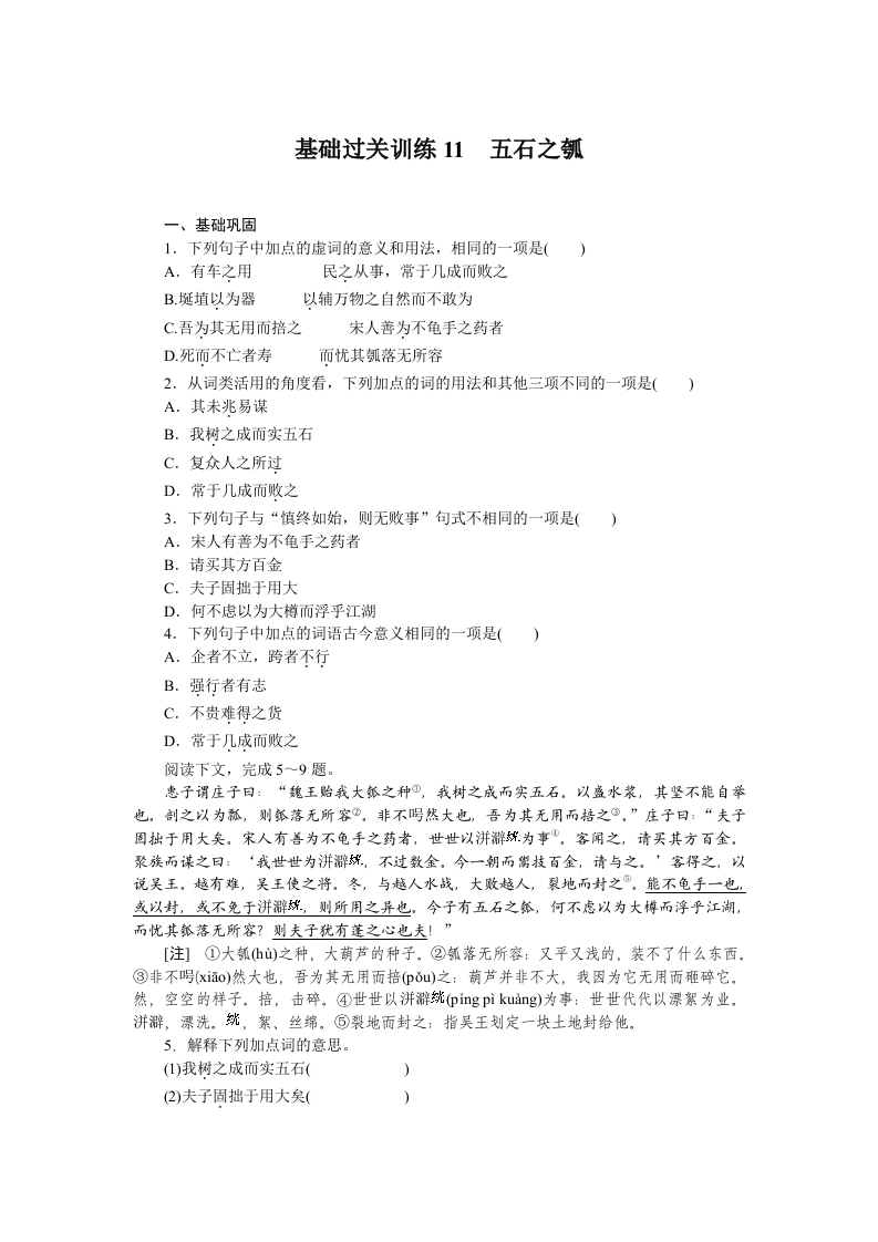 学生啦:基础过关训练11五石之瓠一、基础巩固1.下列句子中加点的虚词的意义和用法,相同的一项是()A.有车之用民之从事,常于几成而败之B.埏埴以为器以辅万物之自然而不敢为C.吾为其无用而掊之宋人善为不龟手之药者D.死而不亡者寿而忧其瓠落无所容2.从词类活用的角度看,下列加点的词的用法和其他三项不同的一项是(A,其未兆易谋B.我树之成而实五石C.复众人之所过D.常于几成而败之3.下列句子与“慎终如始,则无败事”句式不相同的一项是()A.宋人有善为不龟手之药者B.请买其方百金C.夫子固拙于用大D.何不虑以为大樽而浮乎江湖4.下列句子中加点的词语古今意义相同的一项是()A.企者不立,跨者不行B.强行者有志C.不贵难得之货D.常于几成而败之阅读下文,完成59题。惠子谓庄子曰:“魏王贻我大爺之种①,我树之成而实五石。以盛水浆,其坚不能自举聚族而谋之曰:‘我世世为讲群,不过数金。今一朝而鬻技百金,请与之。’客得之,以说吴王。越有难,吴王使之将。冬,与越人水战,大败越人,裂地而封之。能不龟手一也,或以封,或不免于讲,则所用之异也。今子有五石之瓠,何不虑以为大樽而浮乎江湖,而忧其爺落无所容?则夫子犹有蓬之心也夫!”[注]①大瓠h)之种,大葫芦的种子。②瓠落无所容:又平又浅的,装不了什么东西。③非不吗(xo)然大也,吾为其无用而掊pu)之:葫芦并非不大,我因为它无用而砸碎它。然,空空的样子。掊,击碎。④世世以讲澼姚(ping pi kuang)为事:世世代代以漂絮为业。讲澼,漂洗。就,絮、丝绵。⑤裂地而封之:指吴王划定一块土地封给他。5.解释下列加点词的意思。(1)我树之成而实五石((2)夫子固拙于用大矣()