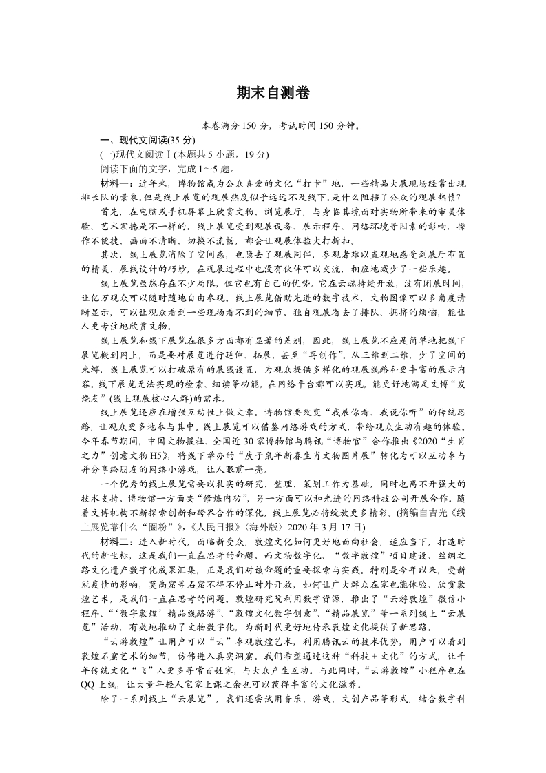 学生啦:期末自测卷本卷满分150分,考试时间150分钟。一、现代文阅读(35分)(一)现代文阅读I(本题共5小题,19分)阅读下面的文字,完成1一5题。材料一:近年来,博物馆成为公众喜爱的文化“打卡”地,一些精品大展现场经常出现排长队的景象。但是线上展览的观展热度似乎远远不及线下,是什么阻档了公众的观展热情?首先,在电脑或手机屏幕上欣赏文物、浏览展厅,与身临其境面对实物所带来的审美体验、艺术震撼是不一样的。线上展览受到观展设备、展示程序、网络环境等因素的影响,操作不便捷、画面不清晰、切换不流畅,都会让观展体验大打折扣,其次,线上展览消除了空间感,也隐去了观展同伴,参观者难以直观地感受到展厅布置的精美、展线设计的巧妙,在观展过程中也没有伙伴可以交流,相应地减少了一些乐趣。线上展览虽然存在不少局限,但它也有自己的优势。它在云端持续开放,没有闭展时间,让亿万观众可以随时随地自由参观。线上展览借助先进的数字技术,文物图像可以多角度清晰显示,可以让观众看到一些现场看不到的细节。独自观展省去了排队、拥挤的烦恼,能让人更专注地欣赏文物。线上展览和线下展览在很多方面都有显著的差别,因此,线上展览不应是简单地把线下展览搬到网上,而是要对展览进行延伸、拓展,甚至“再创作”。从三维到二维,少了空间的束缚,线上展览可以打破原有的展线设置,为观众提供多样化的观展线路和更丰富的展示内容,线下展览无法实现的检索、细读等功能,在网络平台都可以实现,能更好地满足文博“发烧友”(线上观展核心人群)的需求。线上展览还应在增强互动性上做文章。博物馆要改变“我展你看、我说你听”的传统思路,让观众更多地参与其中。线上展览可以借鉴网络游戏的方式,带给观众生动有趣的体验,今年春节期间,中国文物报社、全国近30家博物馆与腾讯“博物官”合作推出《2020“生肖之力”创意文物H5》,将线下举办的“庚子鼠年新春生肖文物图片展”转化为可以互动参与并分享给朋友的网络小游戏,让人眼前一亮。一个优秀的线上展览需要以扎实的研究、整理、策划工作为基础,同时也离不开强大的技术支持。博物馆一方面要“修炼内功”,另一方面可以和先进的网络科技公司开展合作。随着文博机构不断探索创新和跨界合作的深化,线上展览必将绽放更多精彩。(摘编自吉光《线上展览靠什么“圈粉”》,《人民日报》(海外版〉2020年3月17日)材料二:进入新时代,面临新受众,敦煌文化如何更好地面向社会,适应当下,打造时代的新坐标,这是我们一直在思考的命题。而文物数字化、“数字敦煌”项目建设、丝纲之路文化遗产数字化成果汇集,正是我们对该命题的重要探索与实践。特别是今年以来,受新冠疫情的影响,莫高窟等石窟不得不停止对外开放,如何让广大群众在家也能体验、欣赏敦煌艺术,是我们一直在思考的问题。敦煌研究院利用数字资源,推出了“云游敦煌”微信小程序、“‘数宇敦煌’精品线路游”、“敦煌文化数字创意”、“精品展览”等一系列线上“云展览”活动,有效地推动了文物数字化,为新时代更好地传承敦煌文化提供了新思路。“云游敦煌”让用户可以“云”参观敦煌艺术,利用腾讯云的技术优势,用户可以看到敦煌石窟艺术的细节,仿佛进入真实洞窟。我们希望通过这种“科技+文化”的方式,让千年传统文化“飞”入更多寻常百姓家,与大众产生互动。与此同时,“云游敦煌”小程序也在QQ上线,让大量年轻人宅家上课之余也可以获得丰富的文化滋养,除了一系列线上“云展览”,我们还尝试用音乐、游戏、文创产品等形式,结合数字科