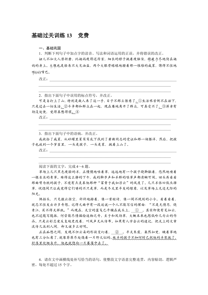 学生啦:基础过关训练13党费一、基础巩固1.判断下列句子中加点字的读音、写法和词语运用的正误,并将错误的改正。妞儿不如大人禁折磨,比她妈瘦得还厉害,细长的脖子挑着瘦脑袋,精疲力尽地侍在她妈的身上。大慨也是轻易不大见油盐,两个大眼骨碌碌地瞪着那一堆堆的咸莱,馋得不住地改正:2.指出下面句子中误用的标点符号,并改正。可是自打上了山,特别是敌人来了这一手,日子不那么惬意了,①生活艰苦倒不在话下,只是过去一切生活、②斗争都和群众在一起,现在蓦地离开了群众,可真受不了,③浑身有改正:3.指出下面句子中的语病,并改正。我收拾了咸莱,从砂罐里莱窝窝底下找到了黄新同志的党证和那一块银洋,然后,把孩子也放到一个箩筐里,一头是孩子,一头是莱,挑着上山了。改正:阅读下面的文字,完成4一6题。草场上几只黑色瘦腔的羊,正慢慢地啮着草,远远地有一个孩子跷脚躺着,悠然地嚼着一根长长的青草。难得这么静的下午,我的脚步声和羊群的啮草声都清晰可闻。回头再看看那曲臂为枕的孩子,不觉有点羡慕他那种“富贵于我如浮云”的风度了。几只羊依旧低头择草,恍惚间只让我觉得它们嚼的不只是草,而是冬天里半发的绿意,以及草场上无边无际的偶抬头,只见微云掠空,斜斜地排着,像一首短诗,像一阕不规则的小令。看着看着,就忍不住发出许多奇想。记得元曲中有一段述说一个人不能写信的理由:“不是无情思,绕青江,买不得天样纸。”而现在,天空的蓝笺已平铺在我头上,Q…其实即使有笔如云,也不过随写随抹,何尝能尽情描绘造物之奇。至于和风劲草,大概本来也想低吟几句云的作品。只是云彩总爱反复地更改着,叫风声无从传布。如果有人学会云的速记,把天上的文章流传几篇到人间,却又该多么好呢。正在痴想之间,发现不但云朵的形状变幻着,②半天朱霞,梨然如焚,映着草地也有三分红意了,就像莽原尽处烧着一片野火似的,牧羊的孩子不知何时已把他的羊聚拢了4.请在文中画横线处补写恰当的语句,使整段文字语意完整连贯,内容贴切,逻辑严密,每处不超过15个字。