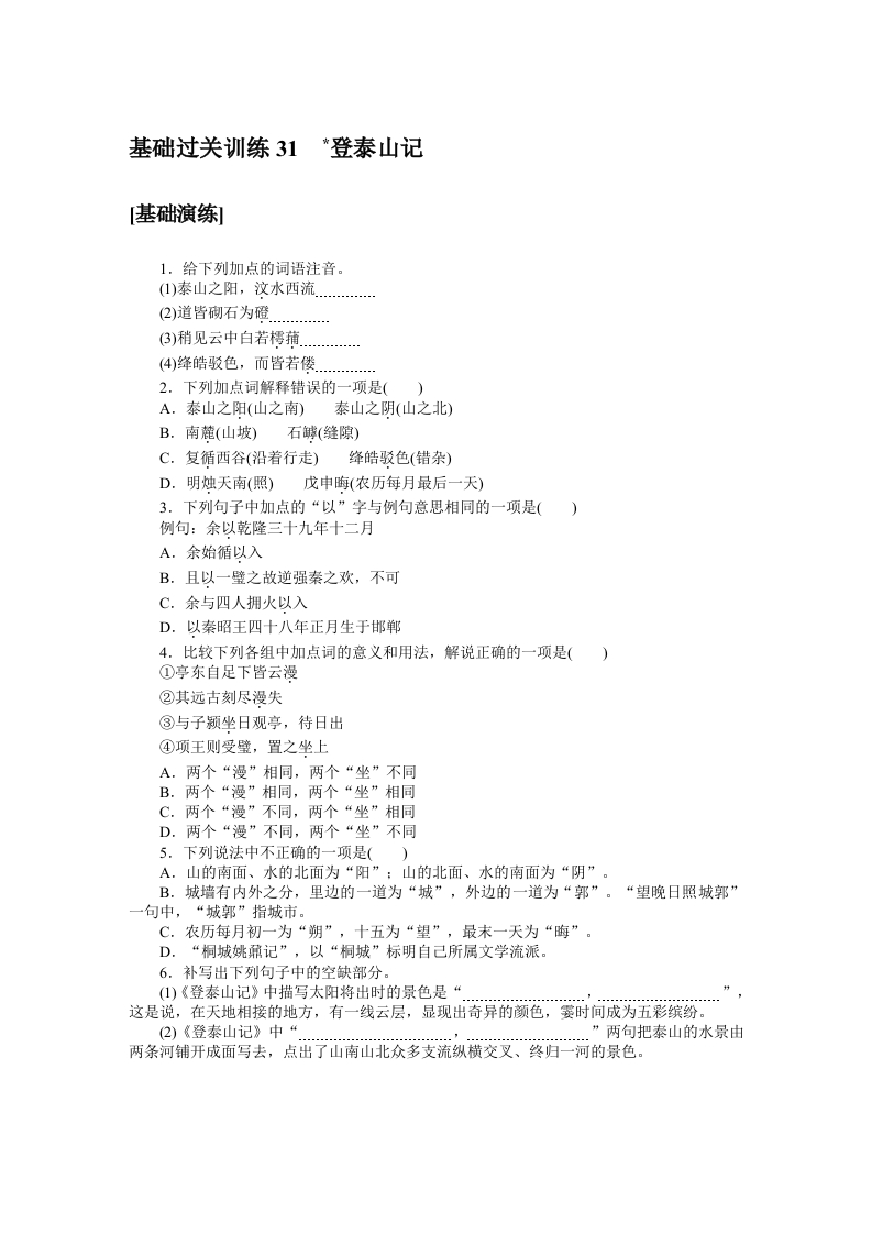 学生啦:基础过关训练31*登泰山记基础演练]1.给下列加点的词语注音。(2)道皆砌石为磴(4绛皓驳色,而皆若偻2.下列加点词解释错误的一项是(A.泰山之阳(山之南)泰山之阴(山之北)B.南麓(山坡)石罅(缝隙)C.复循西谷(沿着行走)绛皓驳色(错杂)D.明烛天南(照)戊申晦(农历每月最后一天)3.下列句子中加点的“以”字与例句意思相同的一项是(例句:余以乾隆三十九年十二月A.余始循以入B.且以一璧之故逆强秦之欢,不可C.余与四人拥火以入D.以秦昭王四十八年正月生于邯郸4.比较下列各组中加点词的意义和用法,解说正确的一项是()①亭东自足下皆云漫②其远古刻尽漫失③与子颍坐日观亭,待日出④项王则受璧,置之坐上A.两个“漫”相同,两个“坐”不同B.两个“漫”相同,两个“坐”相同C.两个“漫”不同,两个“坐”相同D.两个“漫”不同,两个“坐”不同5.下列说法中不正确的一项是()A.山的南面、水的北面为“阳”:山的北面、水的南面为“阴”。B.城墙有内外之分,里边的一道为“城”,外边的一道为“郭”。“望晚日照城郭”一句中,“城郭”指城市。C.农历每月初一为“朔”,十五为“望”,最末一天为“晦”。D.“桐城姚鼐记”,以“桐城”标明自己所属文学流派。6.补写出下列句子中的空缺部分。(1)《登泰山记》中描写太阳将出时的景色是“这是说,在天地相接的地方,有一线云层,显现出奇异的颜色,窦时间成为五彩缤纷。(2)《登泰山记》中“”两句把泰山的水景由两条河铺开成面写去,点出了山南山北众多支流纵横交叉、终归一河的景色。