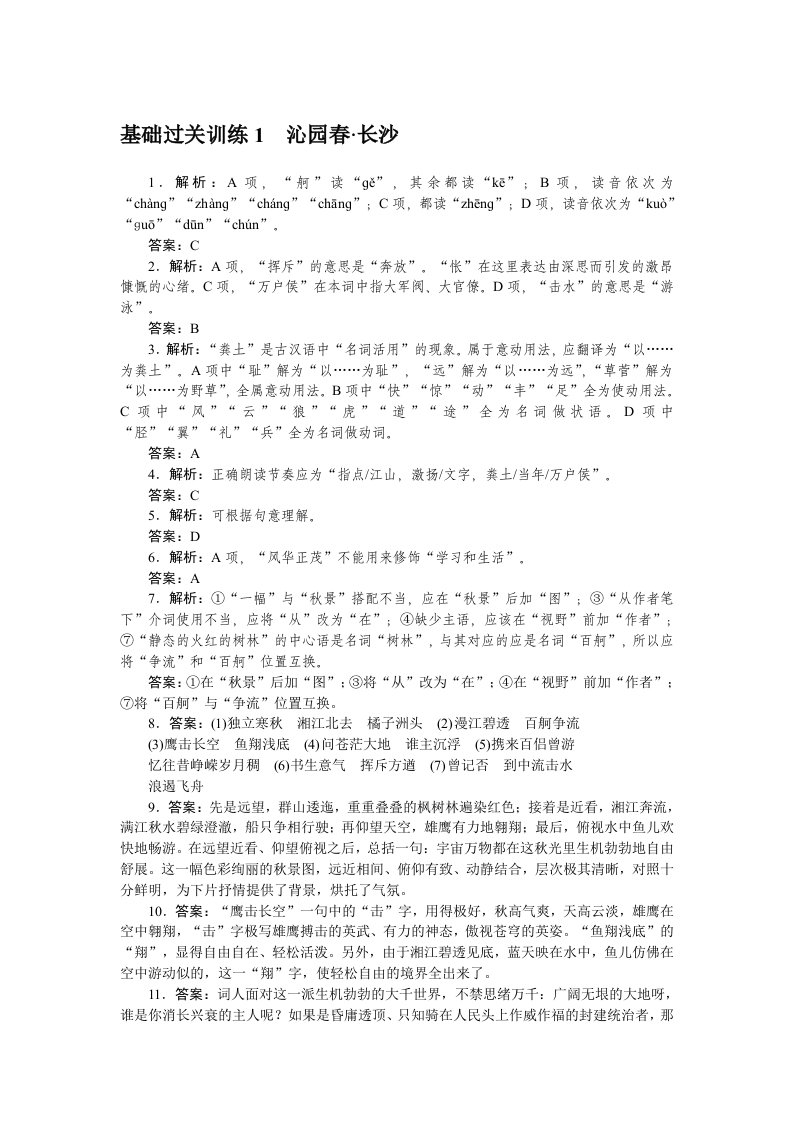 学生啦:基础过关训练1沁园春·长沙1.解析:A项,“舸”读“gě”,其余都读“k”;B项,读音依次为“chang”“zhang'”“chng”“chang”;C项,都读“zhng”;D项,读音依次为“kud”“guo”“din”“chin”答案:C2.解析:A项,“挥斥”的意思是“奔放”。“怅”在这里表达由深思而引发的激吊慷慨的心绪。C项,“万户侯”在本词中指大军阀、大官僚。D项,“击水”的意思是“游泳”答案:B3.解析:“粪土”是古汉语中“名词活用”的现象。属于意动用法,应翻译为“以…为粪土”。A项中“耻”解为“以…为耻”,“远”解为“以…为远”,“草营”解为“以…为野草”,全属意动用法。B项中“快”“惊”“动”“丰”“足”全为使动用法。C项中“风”“云”“狼”“虎”“道”“途”全为名词做状语。D项中“胫”“翼”“礼”“兵”全为名词做动词。答案:A4.解析:正确朗读节奏应为“指点/江山,激扬/文字,粪土/当年/万户侯”。答案:C5.解析:可根据句意理解。答案:D6.解析:A项,“风华正茂”不能用来修饰“学习和生活”。答案:A7.解析:①“一幅”与“秋景”搭配不当,应在“秋景”后加“图”;③“从作者笔下”介词使用不当,应将“从”改为“在”;④缺少主语,应该在“视野”前加“作者”;⑦“静态的火红的树林”的中心语是名词“树林”,与其对应的应是名词“百舸”,所以应将“争流”和“百舸”位置互换。答案:①在“秋景”后加“图”:③将“从”改为“在”:④在“视野”前加“作者”:⑦将“百舸”与“争流”位置互换。8.答案:(1)独立寒秋湘江北去橘子洲头(2)漫江碧透百舸争流(3)鹰击长空鱼翔浅底(4)问苍茫大地谁主沉浮(⑤)携来百侣曾游忆往昔峥嵘岁月稠(6)书生意气挥斥方遒(⑦)曾记否到中流击水浪遏飞舟9.答案:先是远望,群山逶迤,重重叠叠的枫树林遍染红色:接着是近看,湘江奔流,满江秋水碧绿澄澈,船只争相行驶:再仰望天空,雄鹰有力地翱翔:最后,俯视水中鱼儿欢快地畅游。在远望近看、仰望俯视之后,总括一句:宇宙万物都在这秋光里生机勃勃地自由舒展。这一幅色彩绚丽的秋景图,远近相间、俯仰有致、动静结合,层次极其清晰,对照十分鲜明,为下片抒情提供了背景,烘托了气氛。10.答案:“鹰击长空”一句中的“击”字,用得极好,秋高气爽,天高云淡,雄鹰在空中翱翔,“击”字极写雄鹰搏击的英武、有力的神态,傲视苍穹的英姿。“鱼翔浅底”的“翔”,显得自由自在、轻松活泼。另外,由于湘江碧透见底,蓝天映在水中,鱼儿仿佛在空中游动似的,这一“翔”字,使轻松自由的境界全出来了。11,答案:词人面对这一派生机勃勃的大千世界,不禁思绪万千:广阔无垠的大地呀,谁是你消长兴衰的主人呢?如果是昏庸透顶、只知骑在人民头上作威作福的封建统治者,那