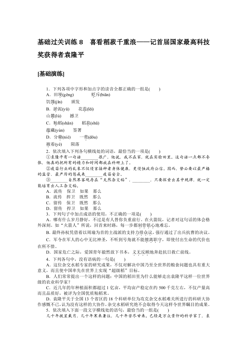 学生啦:基础过关训练8喜看稻菽千重浪一记首届国家最高科技奖获得者袁隆平基础演练]1.下列各项中字形和加点字的读音全都正确的一组是()贬斥(bin)饥馑Gn)颁发B.淤泥y)山麓)撼卫稻菽(sh)签署D.分蘖(nid)2.依次填入下列各句横线处的词语,最恰当的一项是()①袁隆平有一句话很广,他说,我不在家,就在实验田里。这句话一点都不夸张,他真的把所有的精力和时间都放在科研上了。②疫苗行业的乱象不仅侵害接种者身体健康,更侵蚀政府公信。因而,势必要以最严格的监管、最严厉的惩戒来疫苗安全。③自然界客观存在“天然杂交稻”,只要探索出其中规律,就一定能培育出人工杂交稻。A.流传保卫如果那么B.流传捍卫既然那么C.留传保卫既然那么D.留传捍卫如果那么3.下列句子中加点成语的使用,不正确的一项是()A.哪有什么岁月静好,不过是有人替你负重前行。在火箭院,记者对这句话的体会格外深刻。如“火箭人”所说,回首来时路,每一步都刻骨铭心地难忘。B.最终孙权凭借着以周瑜为首的主战派的支持力排众议,强行通过了出兵抗曹的决议。C.军令在军人的心中无比神圣,不听到号角就不能擅离职守,即使付出生命的代价也在所不惜。D.国家危亡之际,爱国青年毅然放下书本,义无反顾地奔赴抗日救亡前线。4.下列各句中,没有语病的一句是()A.这位杂交水稻专家的研究成果,不仅对解决中国乃至全世界的粮食问题也具有重大意义,而且使中国率先在世界上实现“超级稻”目标。B.人们常常提出一个这样的问题:中国的稻田里为什么能够走出袁隆平这样一位世界级的农业科学家?C.近几年的年种植面积都超过1亿亩,平均亩产稳定在约500千克左右,不仅产量高而且品质好,被评为全国优质籼稻米。D.袁隆平关于全国13个省区的18个科研单位为攻克杂交水稻难关所进行的科研大协作感慨不己,认为没有这样的大协作,杂交水稻研究绝不会取得今天这样令世界瞩目的成果。5.依次填入下面一段文字横线处的语句,最恰当的一组是()几十年被星戴月,几十年寒来暑往,几十年苦尽甘来,已经是万众景仰的科学家了,袁