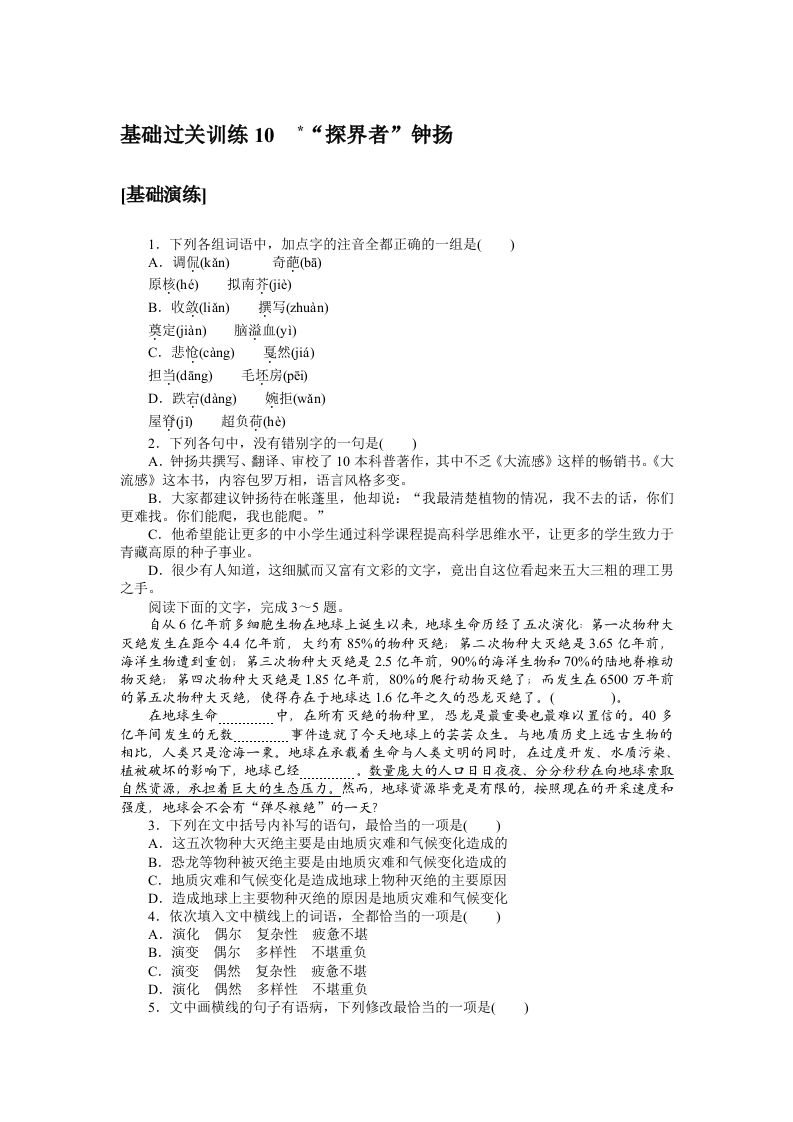 学生啦:基础过关训练10*“探界者”钟扬基础演练]1.下列各组词语中,加点字的注音全都正确的一组是(奇葩ba)原核hB.收敛ian)撰写(zhuan)莫定Gian)C.悲怆(cang)戛然Gia)担当(dang)D.跌宕(dang)婉拒(wǎn)超负荷h)2.下列各句中,没有错别字的一句是()A.钟扬共撰写、翻译、审校了10本科普著作,其中不乏《大流感》这样的畅销书。《大流感》这本书,内容包罗万相,语言风格多变。B.大家都建议钟扬待在帐蓬里,他却说:“我最清楚植物的情况,我不去的话,你们更难找。你们能爬,我也能爬。”C.他希望能让更多的中小学生通过科学课程提高科学思维水平,让更多的学生致力于青藏高原的种子事业。D.很少有人知道,这细腻而又官有文彩的文字,竞出自这位看起来五大三粗的理工男之手。阅读下面的文字,完成3~5题。自从6亿年前多细胞生物在地球上诞生以来,地球生命历经了五次演化:第一次物种大灭绝发生在距今4.4亿年前,大约有85%的物种灭绝:第二次物种大灭绝是3.65亿年前,海洋生物遭到重创:第三次物种大灭绝是2.5亿年前,90%的海洋生物和70%的陆地脊推动物灭绝:第四次物种大灭绝是1.85亿年前,80%的爬行动物灭绝了;而发生在6500万年前的第五次物种大灭绝,使得存在于地球达1.6亿年之久的恐龙灭绝了。(在地球生命中,在所有灭绝的物种里,恐龙是最重要也最难以置信的。40多亿年间发生的无数事件造就了今天地球上的芸芸众生。与地质历史上远古生物的相比,人类只是沧海一聚。地球在承载着生命与人类文明的同时,在过度开发、水质污染、植被破坏的影响下,地球已经自然资源,承担着巨大的生态压力。然而,地球资源毕竞是有限的,按照现在的开采速度和强度,地球会不会有“弹尽粮绝”的一天?3.下列在文中括号内补写的语句,最恰当的一项是(A.这五次物种大灭绝主要是由地质灾难和气候变化造成的B.恐龙等物种被灭绝主要是由地质灾难和气候变化造成的C.地质灾难和气候变化是造成地球上物种灭绝的主要原因D.造成地球上主要物种灭绝的原因是地质灾难和气侯变化4.依次填入文中横线上的词语,全都恰当的一项是()A.演化偶尔复杂性疲惫不堪B.演变偶尔多样性不堪重负C.演变偶然复杂性疲惫不堪D.演化偶然多样性不堪重负5.文中画横线的句子有语病,下列修改最恰当的一项是(