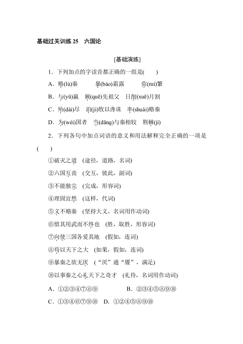 学生啦:基础过关训练25六国论[基础演练]1.下列加点的字读音都正确的一组是(暴(bao)霜露弥(mi)繁C.殆(dai)尽洎G)牧以谗诛率(shuai)赂秦D.为(wei)国者当(dang)与秦相较荆棘Gj的2.下列各句中加点词语的意义和用法解释完全正确的一项是①破灭之道(途径,道路,名词)②六国互丧(交互,彼此,副词③不能独完(完成,形容词)④理固宜然(这样,代词⑤义不赂秦(坚持大义,名词用作动词)⑥惜其用武而不终也(胜,取胜,形容词)⑦向使三国各爱其地(假如,连词)⑧苟以天下之大(如果,假如,连词⑨暴秦之欲无厌(“厌”通“餍”,满足)⑩以事秦之心礼天下之奇才(礼待,名词用作动词)A.①②③④⑦⑧⑨B.②③④⑤⑧⑨0C.①③④⑥⑦⑨⑩D.①②④⑤⑧⑨⑩