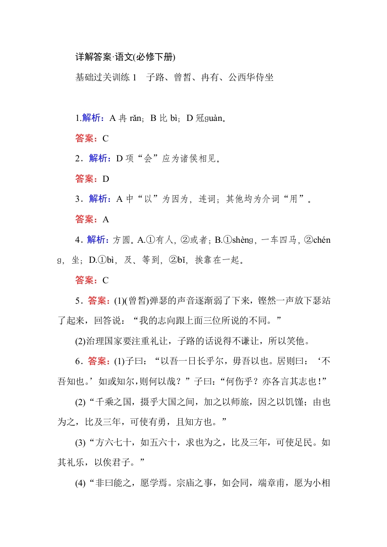学生啦:详解答案·语文(必修下册)基础过关训练1子路、曾皙、冉有、公西华侍坐l.解析:A冉ran;B比bi;D冠guan。答案:C2.解析:D项“会”应为诸侯相见。答案:D3.解析:A中“以”为因为,连词;其他均为介词“用”。答案:A4.解析:方圆。A.①有人,②或者;B.①shèng,一车四马,②chéng,坐;D.①bi,及、等到,②bi,挨靠在一起。答案:C5.答案:(1)(曾皙)弹瑟的声音逐渐弱了下来,铿然一声放下瑟站了起来,回答说:“我的志向跟上面三位所说的不同。”(2)治理国家要注重礼让,子路的话说得不谦让,所以笑他。6,答案:(1)子曰:“以吾一日长乎尔,毋吾以也。居则曰:‘不吾知也。’如或知尔,则何以哉?”子曰:“何伤乎?亦各言其志也!”(2)“千乘之国,摄乎大国之间,加之以师旅,因之以饥馑;由也为之,比及三年,可使有勇,且知方也。”(3)“方六七十,如五六十,求也为之,比及三年,可使足民。如其礼乐,以俟君子。”(4)“非曰能之,愿学焉。宗庙之事,如会同,端章甫,愿为小相