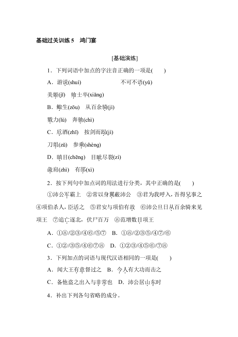 学生啦:基础过关训练5鸿门宴[基础演练]1.下列词语中加点的字注音正确的一项是(A.游说(shui)不可不语(y)飨士卒(xiang)B.鲰生(zou)从百余骑Gi)戮力)奔驰(chi)C.卮酒(zh)按剑而跽G)刀俎(z参乘(sheng)D.瞋目(cheng)目眦尽裂(zi)彘肩(zhi)有郤(xi)2.按下列句中加点词的用法进行分类,其中正确的是()①沛公军霸上②常以身翼蔽沛公③君为我呼入,吾得兄事之④项伯杀人,臣活之⑤君安与项伯有故⑥沛公旦日从百余骑来见项王⑦追亡逐北,伏尸百万⑧范增数目项王A.①⑧/②③/④⑥/⑤⑦B.①⑧/②③⑤/④⑦1⑥C.①②③⑤/④⑥⑦⑧D.①②③/④⑤⑥/⑦⑧3.下列加点的词语与现代汉语相同的一项是()A.闻大王有意督过之B.今人有大功而击之C.备他盗之出入与非常也D.沛公居山东时4.补出下列各句省略的成分。