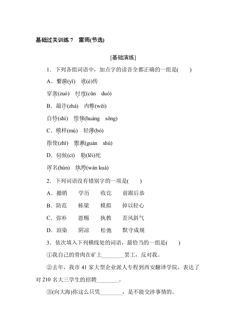 学生啦:基础过关训练7雷雨(节选)[基础演练]1.下列各组词语中,加点字的读音全都正确的一组是()穿凿(zuo)忖度(cun duo)B.敲诈(zha)内帷(wěi自恃(shi)惶悚huang ssǒng)C.模样(m)轻薄b6)指使(zh)盥漱(guan shù)D.伺候(ci)勒Ii)死诨名hdn)纨绔(wan kua)2.下列词语没有错别字的一项是(学历收讫前踞后恭B.防范栋梁模拟掉以轻心C.弥补恩赐执教歪风斜气D.渲染阴凉松弛默守成规3.依次填入下列横线处的词语,最恰当的一组是()①我自己的骨肉在矿上罢工,反对我。②去年,我市41家大型企业派人专程到西安翻译学院,表达了对210名大三学生的招聘③(向大海)你这么只凭,是不能交涉事情的。