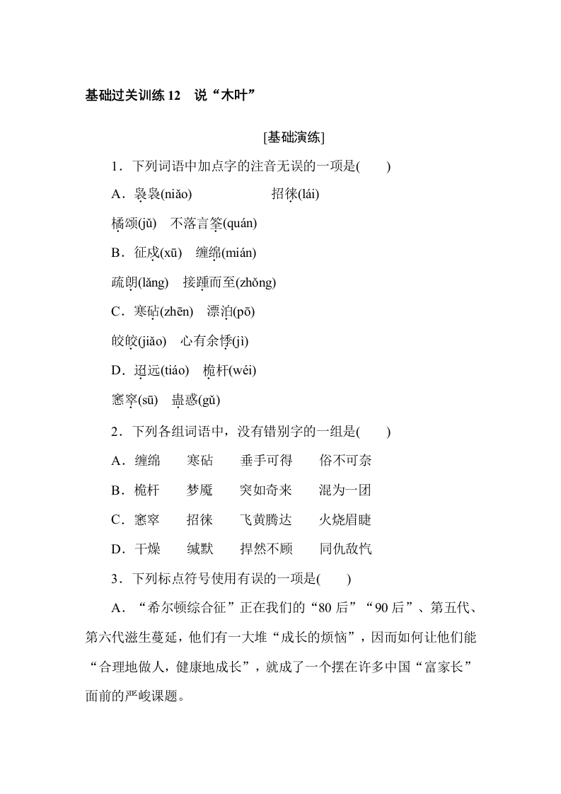 学生啦:基础过关训练12说“木叶”[基础演练]1.下列词语中加点字的注音无误的一项是()不落言筌(quan)B.征戍(x)缠绵(mian)接踵而至(zhǒng)C.寒砧(zhen)漂泊(p)皎皎Giǎo)心有余悸Gi)蛊惑(gi)2.下列各组词语中,没有错别字的一组是()寒砧垂手可得俗不可奈B.桅杆梦魇突如奇来混为一团招徕飞黄腾达火烧眉睫D.干燥缄默捍然不顾同仇敌忾3.下列标点符号使用有误的一项是()A.“希尔顿综合征”正在我们的“80后”“90后”、第五代、第六代滋生蔓延,他们有一大堆“成长的烦恼”,因而如何让他们能“合理地做人,健康地成长”,就成了一个摆在许多中国“富家长”面前的严峻课题。