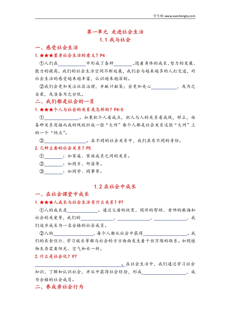 学生啦:学生啦www.xueshengla.com第一单元走进社会生活1.1我与社会一、感受社会生活1.★★★置身社会生活的意义?P4①人们在中形成了各种。随着身体的成长、智力的发展、能力的提高,我们的社会生活空间不断延展,我们会与越来越多的人打交道,对社会生活的感受越来越丰富,认识越来越深刻。②我们会更加关注社区治理,并献计献策;会更加关心或为之自豪,或准备为之分忧。二、我们都是社会的一员1.★★★个人与社会的关系是怎样的?P45①。如果把个人看成点,把人与人的关系看成线,那么,由各种关系连接而成的线就织成一张“大网”每个人都是社会关系这张“大网”上的一个“结点”。②在不同的社会关系中,我们具有不同的身份。2.几种主要的社会关系?P5①:如家庭、家族成员之间的关系。②如同乡、邻居等。③如同学、同事等。1.2在社会中成长一、在社会课堂中成长1.★★★人成长与社会生活有什么关系?P7①人的成长是。通过父母的抚育、同伴的帮助、老师的教诲和社会的关爱等,我们的们逐步成长为一名合格的社会成员。②人的每个人都从社会中获得。我们的衣食住行、学习娱乐等都与社会的方方面面发生着千丝万缕的联系。如同植物生存需要阳光、空气和水一样。2.什么是社会化?P7。在社会生活中,我们通过学习社会知识,了解和认识社会,并从中获得社会经验,形成成为合格的社会成员。二、养成亲社会行为