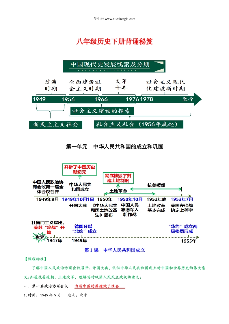 学生啦:学生啦www.xueshengla.com八年级历史下册背诵秘笈中国现代史发展线索及分期过渡全面建设社社会主义现代时期会主义时期十年化建设新时期19491956196619761978社会主义建设的探索新民主主义社会社会主义社会(1956年底起)第一单元中华人民共和国的成立和巩固开辟了中国历史新纪元彻底摧毁了封中国人民政治协建土地制度商会议第一届全中华人民共抗美援朝体会议召开和国成立土地革命1949年9月1949年10月1日1950年1950年10月1952年底1953年7月开国大典《中华人民共中国人民美国在停战和国土地改革志愿军入基本完成协定上签字法》颁布朝作战杜鲁门主义提出,美苏“冷战”开德国分裂“华约”成立两L始“北约”成立极格局形成471949年1955年第1课中华人民共和国成立【课程标准】了解中国人民政治协商会议召开、开国大典,认识中华人民共和国成立对中国和世界历史的伟大意义;知道抗美援朝、土地改革,理解其对巩固人民民主政权的意义:一、第一届政治协商会议为新中国的筹建做了准备1.时间:1949年9月地,点:北平