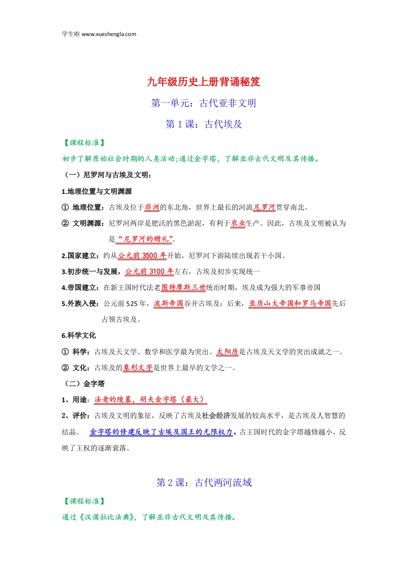 学生啦:学生啦www.xueshengla..com九年级历史上册背诵秘笈第一单元:古代亚非文明第1课:古代埃及【课程标准】初步了解原始社会时期的人类活动;通过金字塔,了解亚非古代文明及其传播。(一)尼罗河与古埃及文明:1.地理位置与文明渊源①地理位置:古埃及位于非洲的东北角,世界上最长的河流尼罗河贯穿南北。②文明渊源:尼罗河两岸是肥沃的黑色淤泥,有利于农业生产。因此,古埃及文明被认为是“尼罗河的赠礼”。2.国家建立:约从公元前3500年开始,尼罗河下游陆续出现若干小国。3.初步统一与发展,公元前3100年左右,古埃及初步实现统一4帝国建立:在新王国时代法老图特摩斯三世统治时期,埃及成为强大的军事帝国5.外族入侵:公元前525年,波斯帝国吞并古埃及:后来,亚历山大帝国和罗马帝国先后占领古埃及。6.科学文化①科学:古埃及天文学、数学和医学最为突出。太阳历是古埃及天文学的突出成就之一。②文化:古埃及的象形文字是世界上最早的文学之一。(二)金字塔1、用途:法老的陵墓,胡夫金字塔(最大)2、评价:古埃及文明的象征,反映了古埃及社会经济发展的较高水平,是古埃及人智慧的结晶。金字塔的修建反映了古埃及国王的无限权力。古王国时代的金字塔越修越小,反映了王权的逐渐衰落。第2课:古代两河流域【课程标准】通过《汉漠拉比法典》,了解亚非古代文明及其传播。
