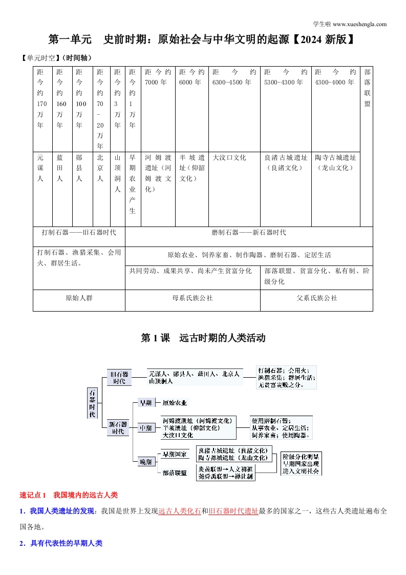学生啦:学生啦www.xueshengla.com第一单元史前时期:原始社会与中华文明的起源【2024新版】【单元时空】(时间轴)距距距距距距距今约距今约距今约距今约距今约部今今7000年6000年6300-4500年5300-4300年4300-4000年落约约约约约联170160100701盟万万万万年年20年万年蓝北山早河姆渡半坡遗良渚古城遗址陶寺古城遗址谋县京顶期遗址(河址(仰韶(良渚文化)(龙山文化)人人人洞农姆渡文文化)人业化)产生打制石器旧石器时代磨制石器一一新石器时代打制石器、渔猎采集、会用原始农业、饲养家畜、制作陶器、磨制石器、定居生活火、群居生活。共同劳动、成果共享、尚未产生贫富分化部落联盟、贫富分化、私有制、阶级分化原始人群母系氏族公社父系氏族公社第1课远古时期的人类活动时一期一原始农业渐器时代大汶1文化速记点1我国境内的远古人类1,我国人类遗址的发现:我国是世界上发现远古人类化石和旧石器时代遗址最多的国家之一,这些古人类遗址遍布全国各地。2.具有代表性的早期人类