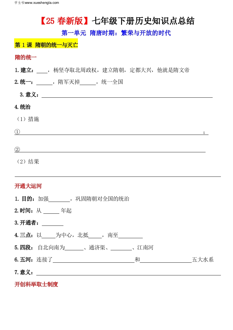 学生啦:学生啦www.xueshengla..com【25春新版】七年级下册历史知识点总结第一单元隋唐时期:繁荣与开放的时代第1课隋朝的统一与灭亡隋的统一1.建立:杨坚夺取北周政权,建立隋朝,定都大兴,他就是隋文帝隋军灭掉,统一全国3.意义:4.统治(1)措施①②(2)结果开通大运河1.目的:加强巩固隋朝对全国的统治2.时间:从年起3.开通者:4.三点:以为中心,北抵,南至5.四段:自北向南为、通济渠、、江南河6.五河:连接了和五大水系7.意义:开创科举取士制度