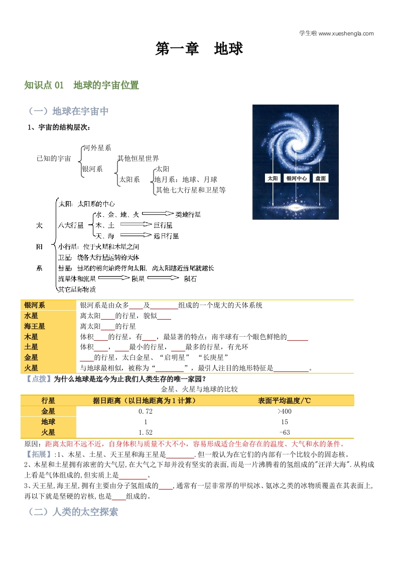 学生啦:学生啦www.xueshengla.com第一章地球知识点01地球的宇宙位置(一)地球在宇宙中1、宇宙的结构层次:河外星系其他恒星世界银河系太阳太阳系地月系:地球、月球太阳银河中心盘面其他七大行星和卫星等太阳:太阳系的巾.心水、金、地、火—太木、土>阳系太阳赵近彗尾就越长银河系银河系是由众多及组成的一个庞大的天体系统水星离太阳的行星,貌似海王星离太阳的行星木星体积的行星,有最显著的特点:南半球有一个眼色鲜艳的土星体积最小的行星,最多的行星,有光环金星的行星,太白金星、“启明星”“长庚星”火星与地球最相似,被称为“”,最引人注目的地形特征是【点拨】为什么地球是迄今为止我们人类生存的唯一家园?金星、火星与地球的比较行星据日距离(以日地距离为1计算)表面平均温度/℃金星0.72>400地球115火星1.52-63原因:距离太阳不远不近,自身体积与质量不大不小,容易形成适合生命存在的温度、大气和水的条件。【拓展】:1、木星、土星、天王星和海王星是但一般认为在它们的内部有一个比较小的固态核。2、木星和土星拥有浓密的大气层,在大气之下却并没有坚实的表面,而是一片沸腾着的氢组成的”汪洋大海”.从构成上看是气体组成的,但实质上是3、天王星,海王星,拥有主要由分子氢组成的一,通常有一层非常厚的甲烷冰、氨冰之类的冰物质覆盖在其表面上,再以下就是坚硬的岩核,也是组成的。(二)人类的太空探索